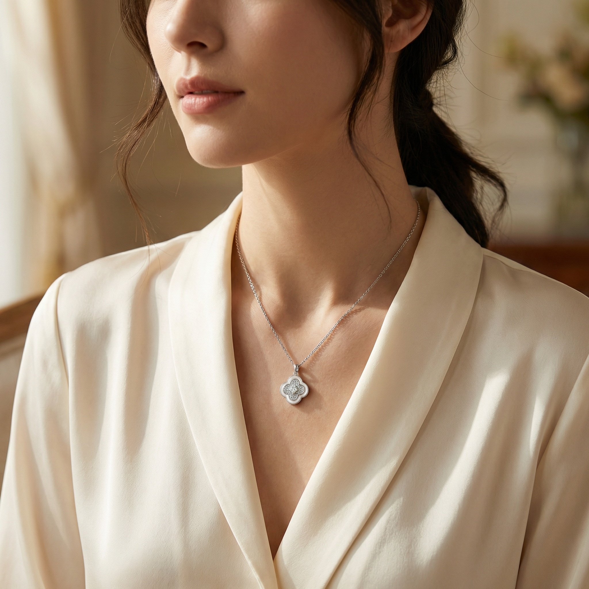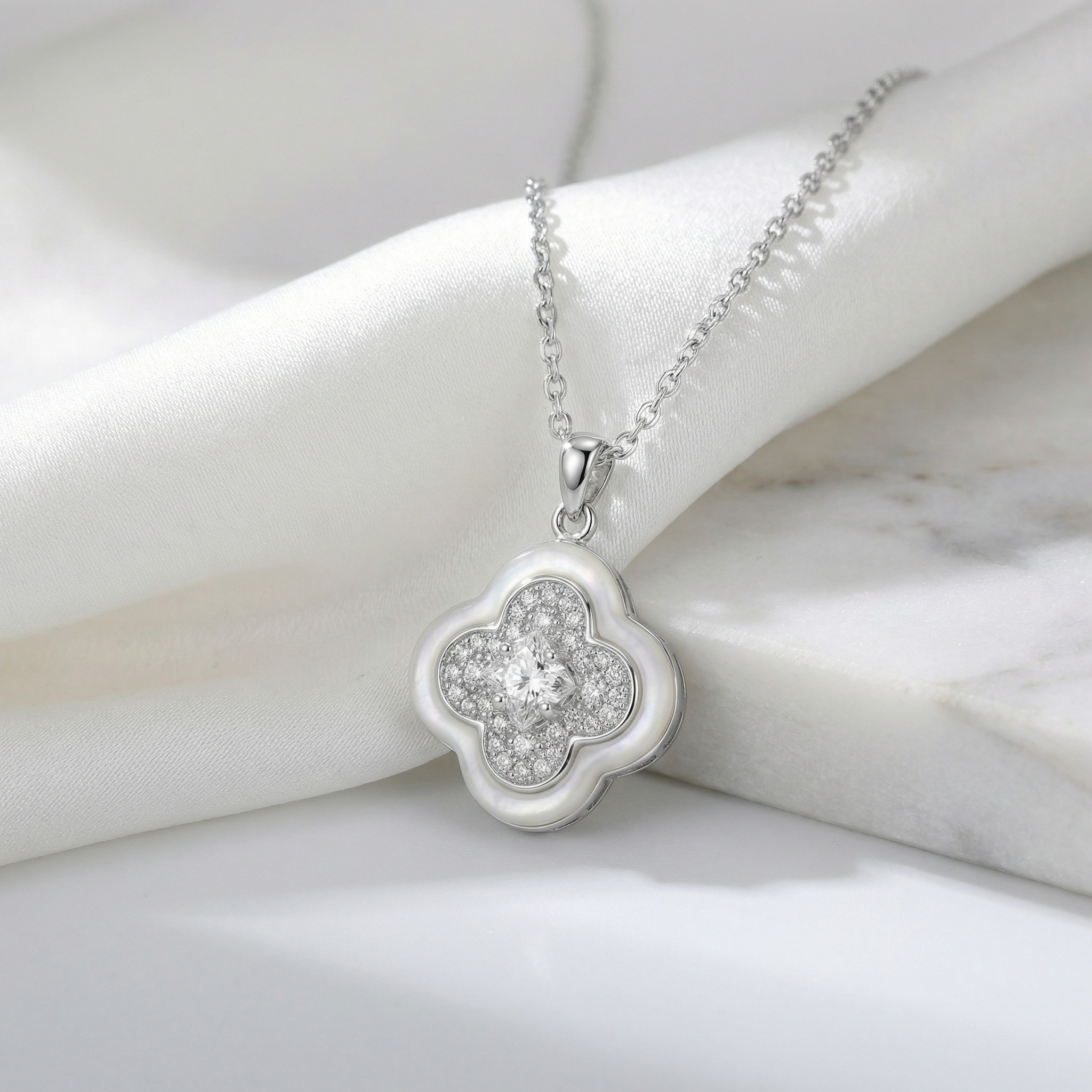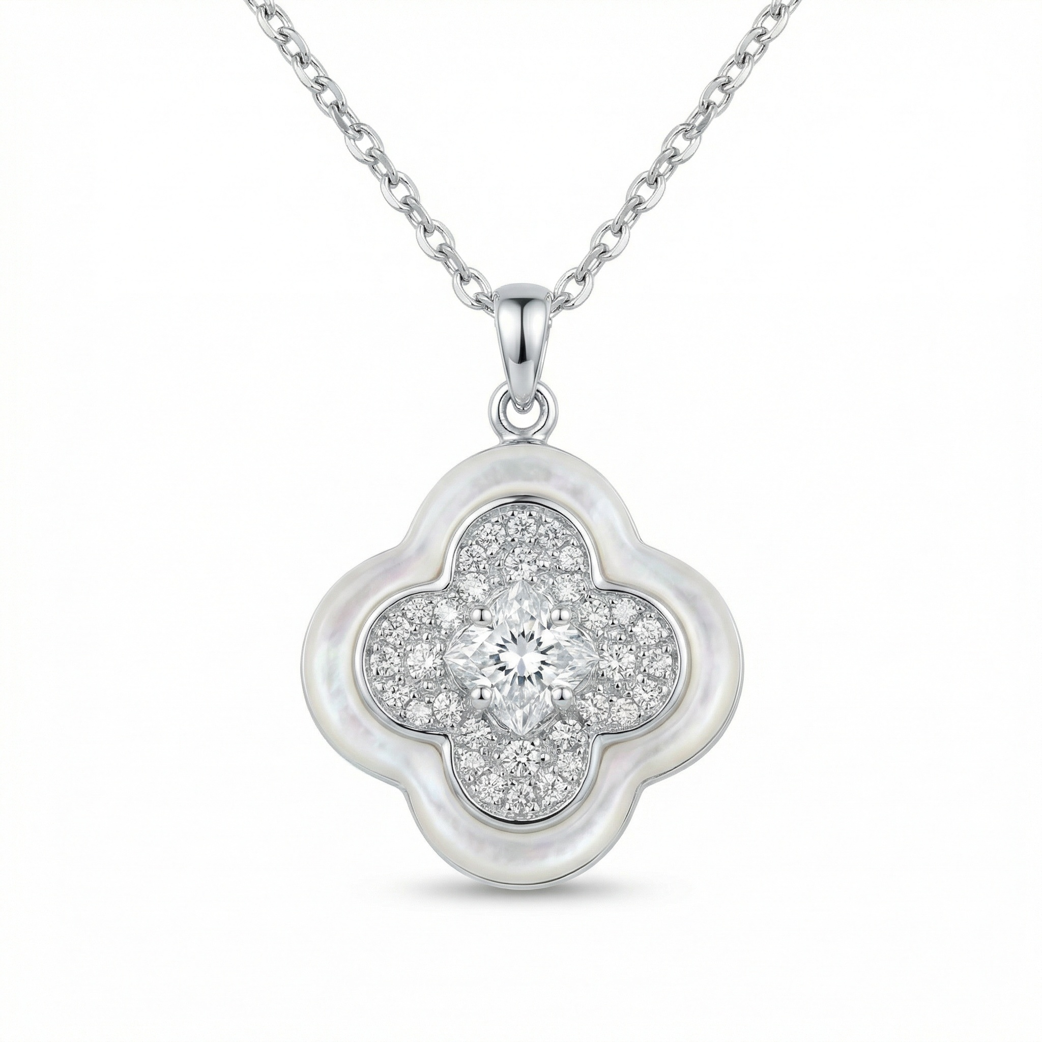 This exquisite necklace features a stunning four-leaf clover pendant, blending classic symbolism with contemporary luxury. The centerpiece is a brilliant diamond, framed by a delicate pavé of smaller shimmering stones. Surrounding this radiant core is a beautifully carved white mother-of-pearl border, which adds a soft, iridescent glow. Crafted in high-quality silver, the pendant hangs gracefully from a refined link chain. Its quatrefoil design is both timeless and sophisticated, making it a perfect accessory for special occasions or adding a touch of elegance to everyday wear. The combination of natural shell and brilliant gems creates a harmonious contrast that captures the light from every angle. | Brand: jewelryodm