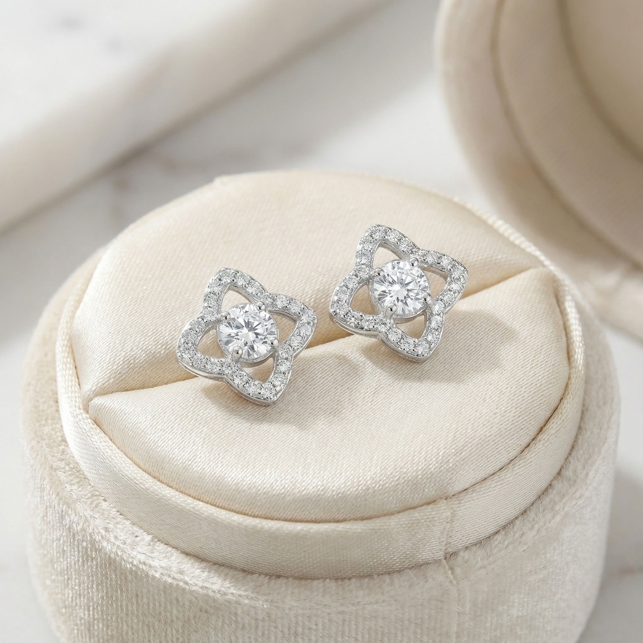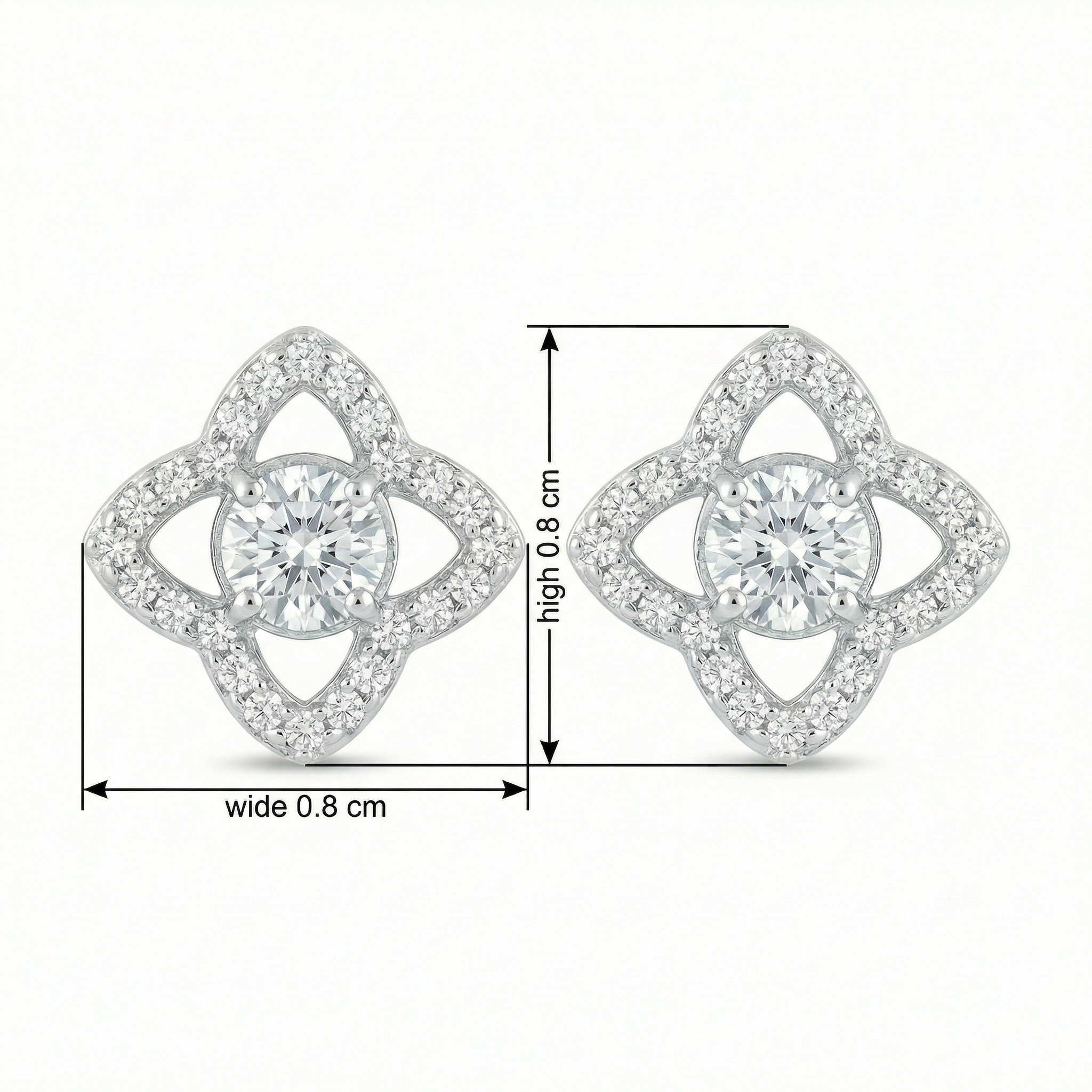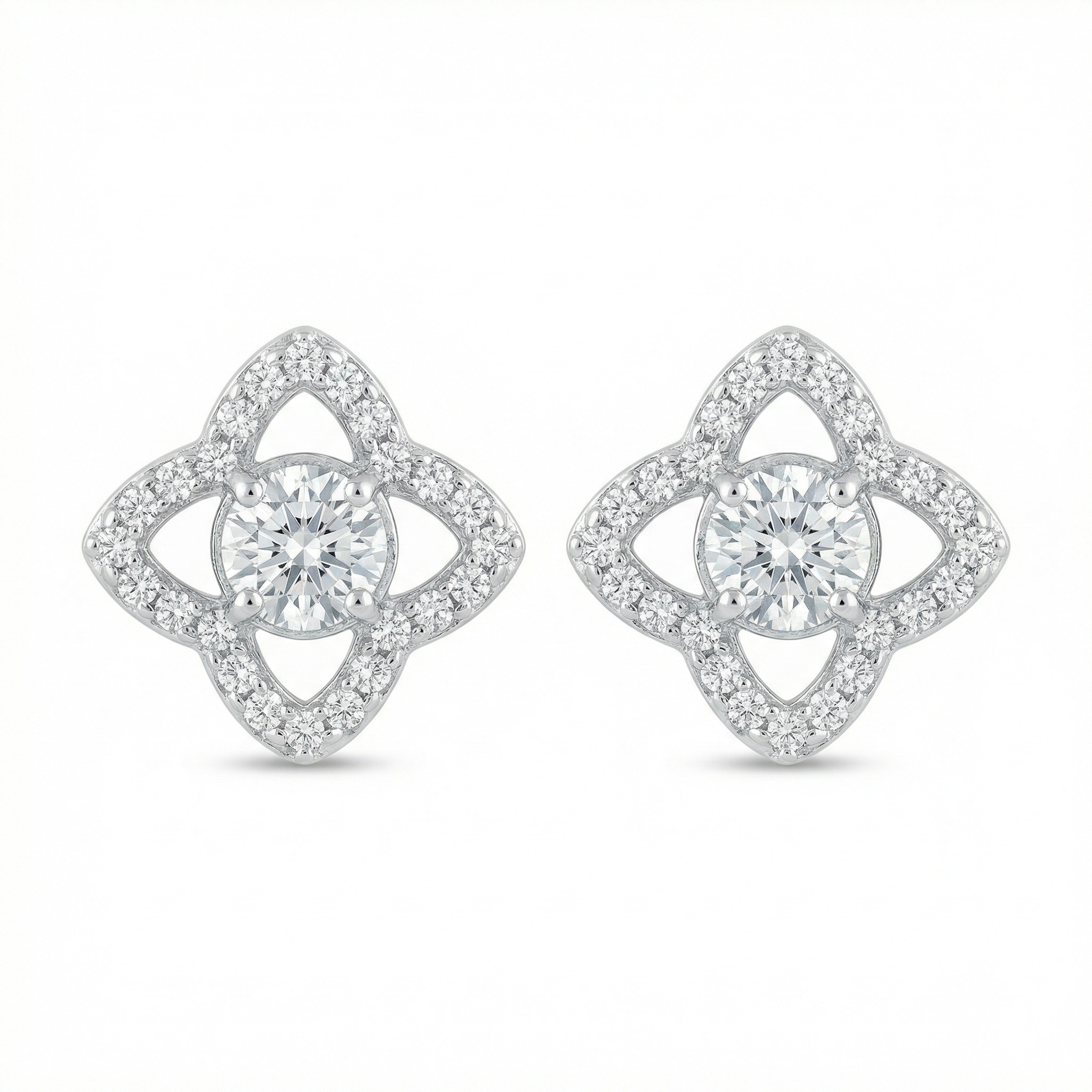 Elevate your elegance with these exquisite diamond stud earrings, designed to capture light from every angle. Each piece features a brilliant round center diamond nestled within a stunning quatrefoil-inspired halo. The open-work frame is intricately pavé-set with shimmering accent diamonds, creating a floral silhouette that feels both modern and timeless. Crafted in high-quality white metal with a polished finish, these earrings provide a sophisticated touch to any ensemble, from professional attire to evening wear. The secure prongs and butterfly backs offer lasting comfort and durability for everyday wear. Whether you are celebrating a special milestone or looking for the perfect gift, these diamond cluster earrings represent a beautiful blend of craftsmanship and sparkle. A versatile and luxurious addition to any fine jewelry collection. | Brand: jewelryodm