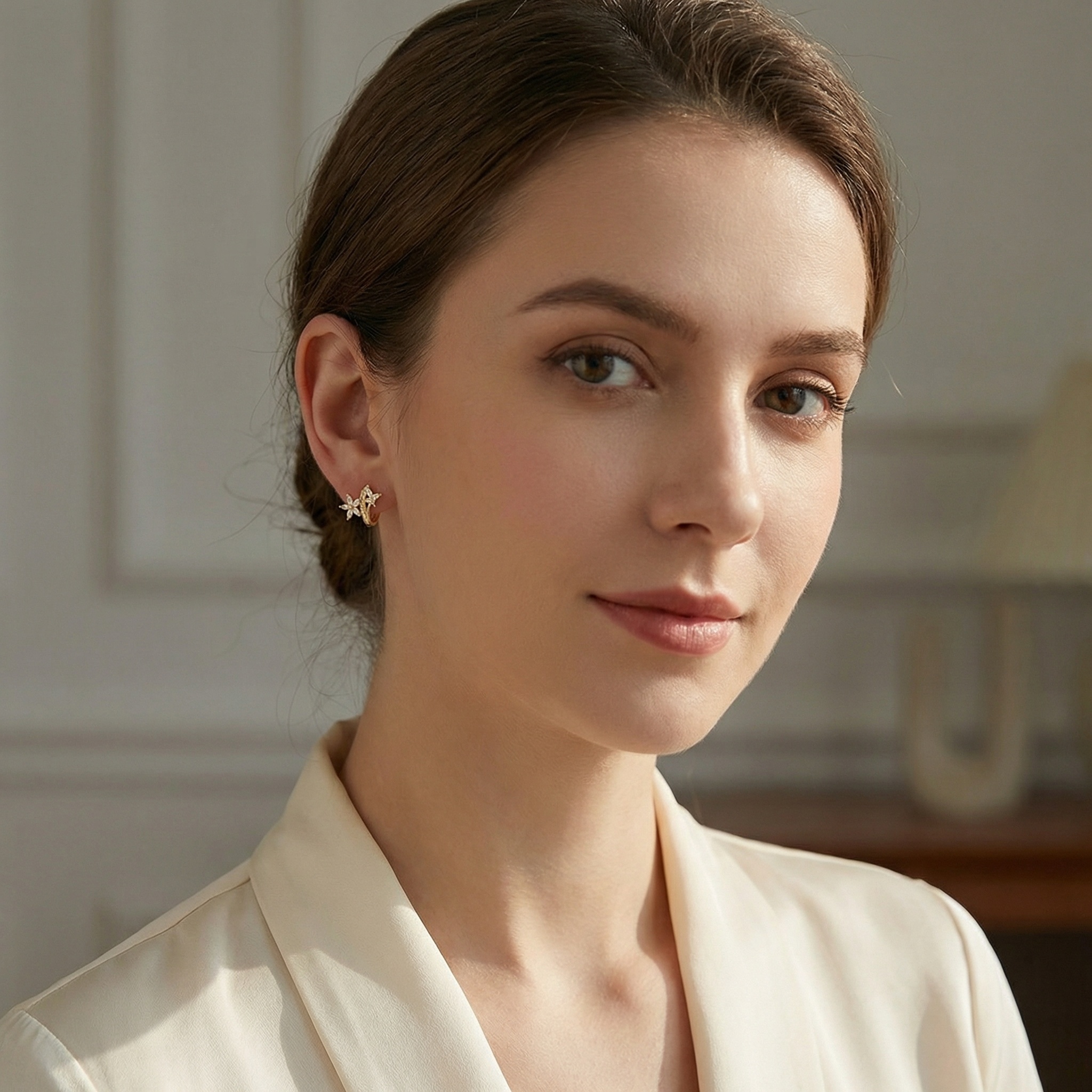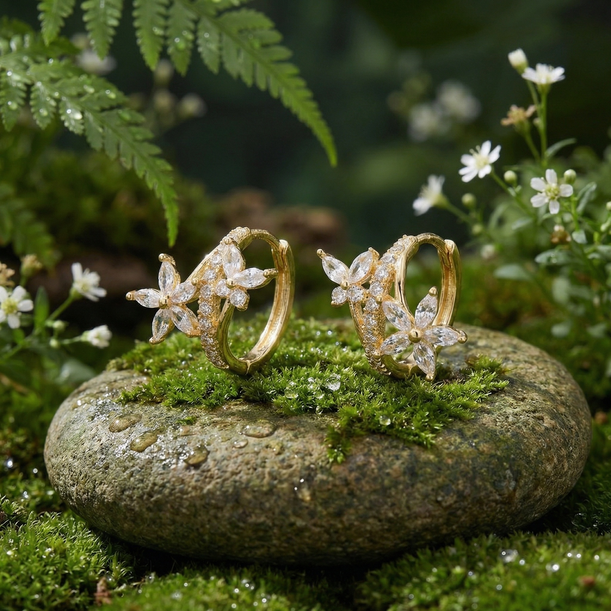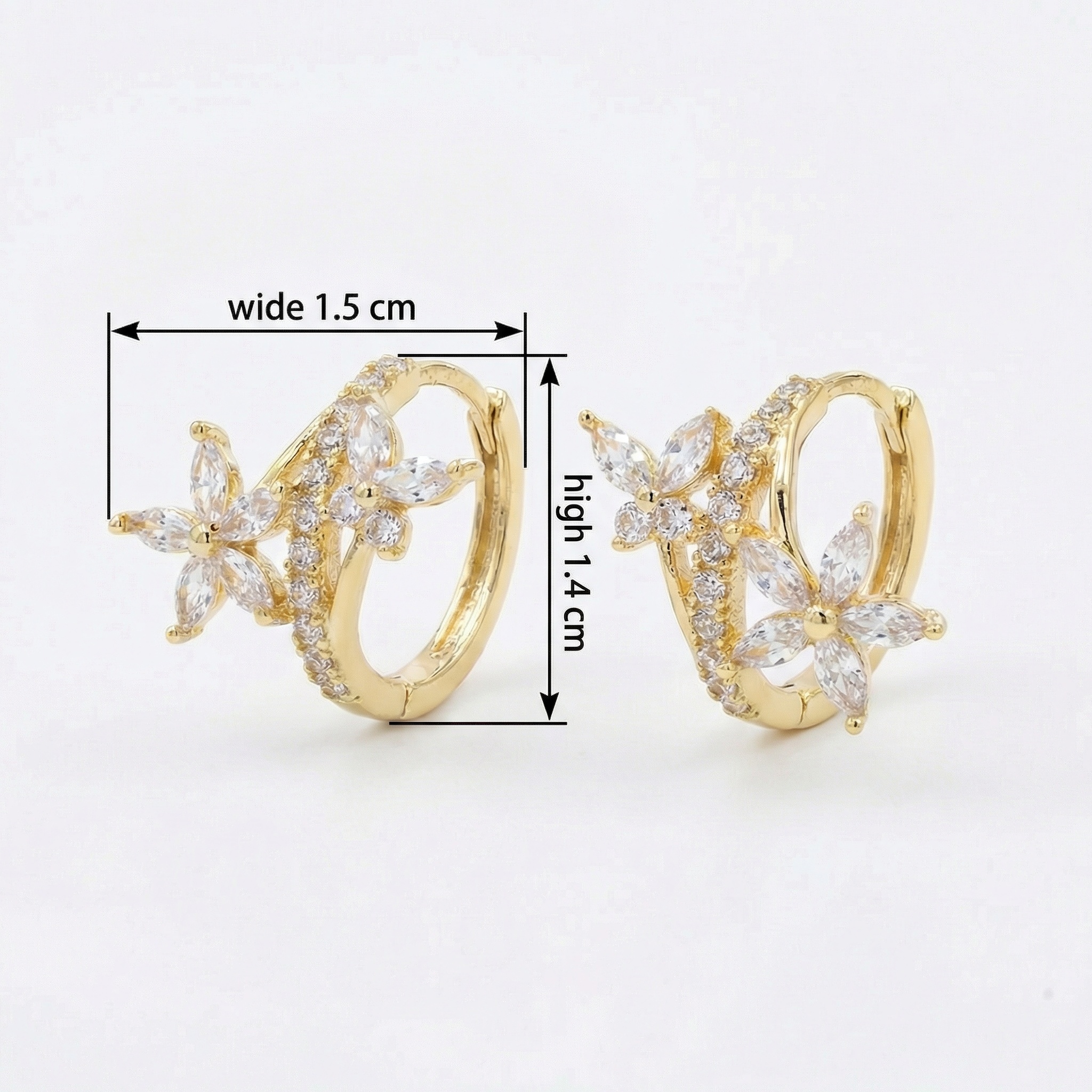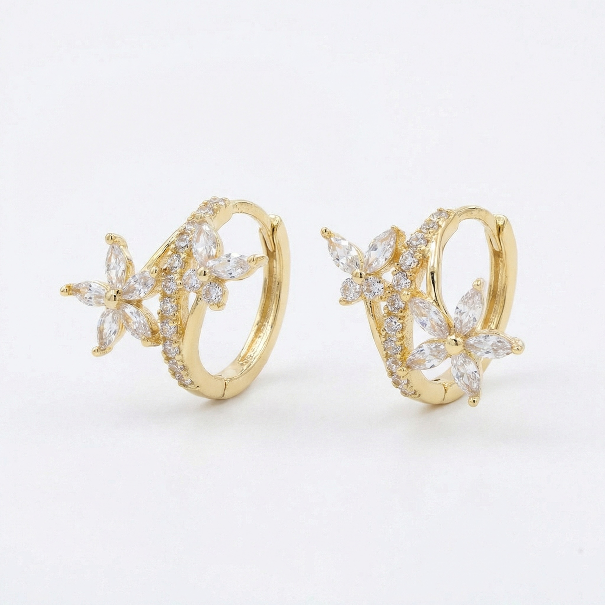 Elevate your jewelry collection with these exquisite floral-inspired huggie hoop earrings. Each piece features a radiant metallic finish that beautifully complements the shimmering clear crystals. The intricate design showcases delicate flower motifs crafted with marquise-cut stones, creating a romantic and feminine look. A curved line of brilliant round-cut accents adds extra sparkle along the hoop's edge. These lightweight earrings are designed with a secure hinged closure for comfortable all-day wear. Perfect for adding a touch of elegance to your daily outfit or for special occasions like weddings and anniversaries. Their timeless floral aesthetic makes them a wonderful gift for someone special. Enjoy the sophisticated combination of classic hoop styling and modern floral artistry. | Brand: jewelryodm