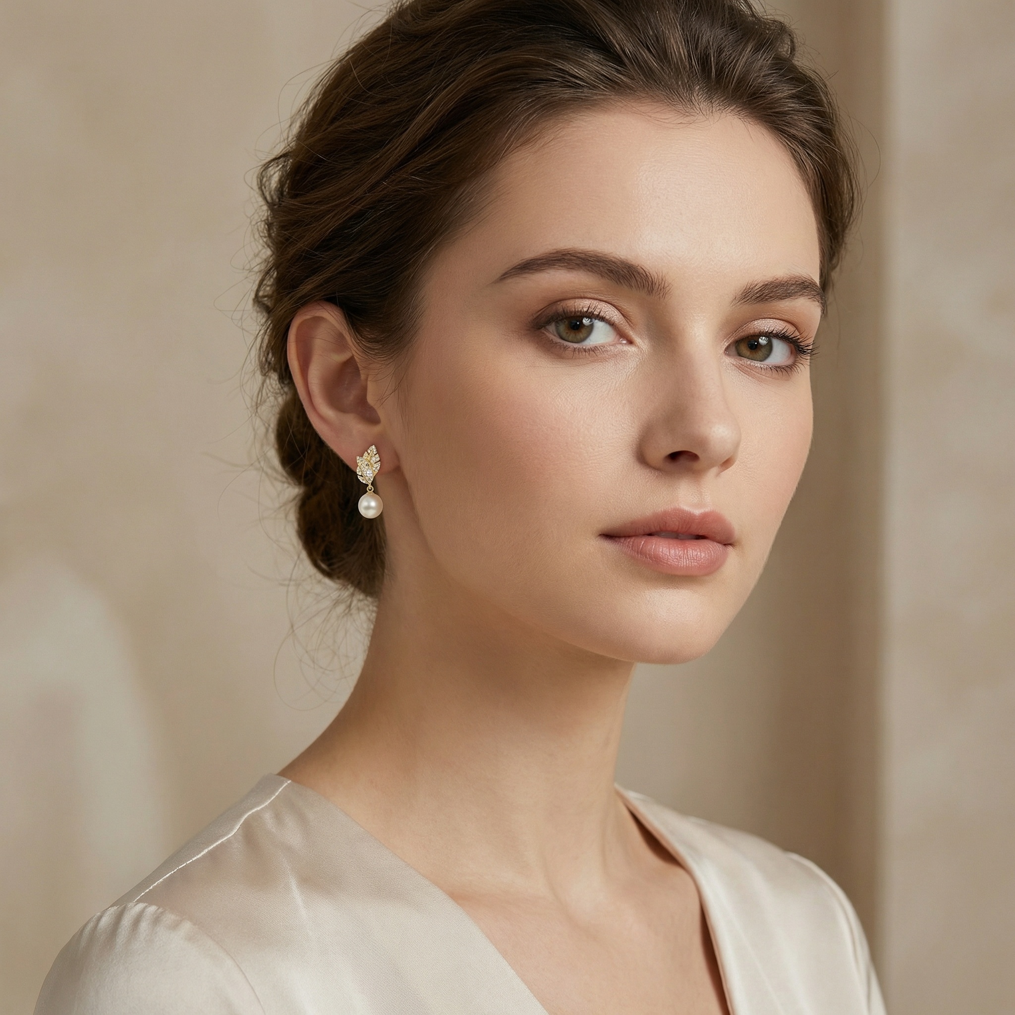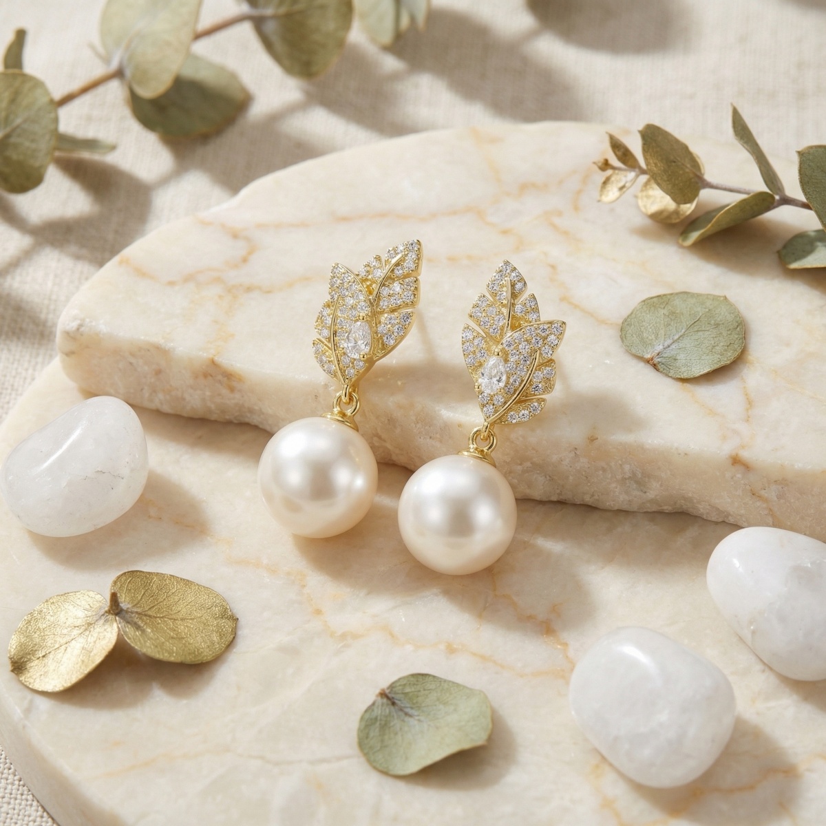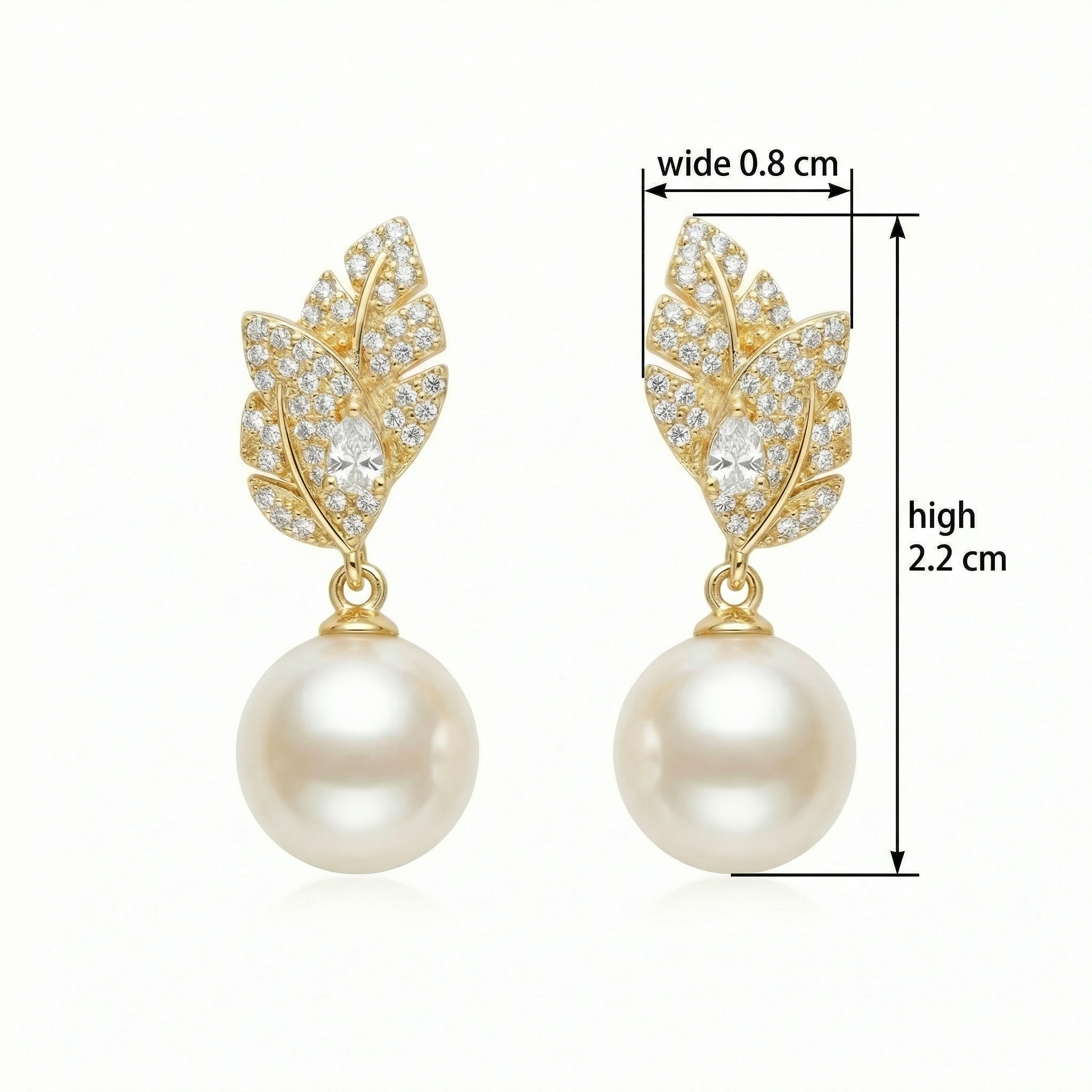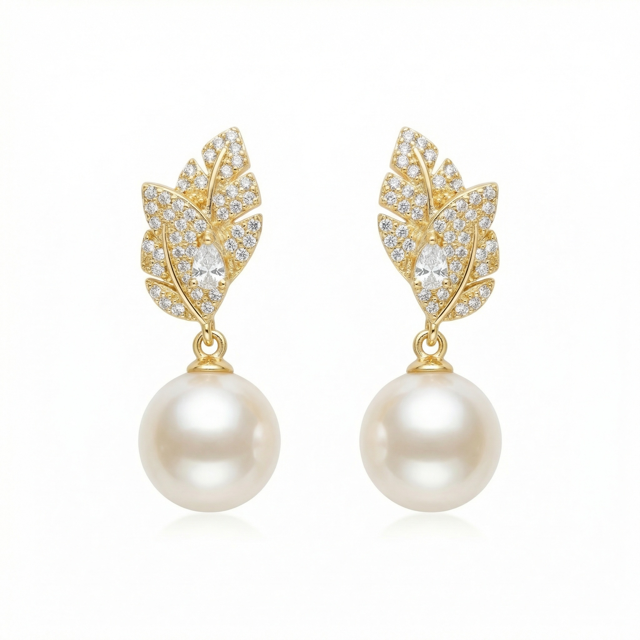 These exquisite drop earrings feature a stunning nature-inspired leaf design, meticulously crafted with shimmering pave-set accents. At the heart of each leaf sits a brilliant pear-cut stone, adding a touch of sophisticated radiance. Suspended gracefully beneath the leafy crowns are two perfectly round, creamy white pearls with a rich, satiny luster. The warm metallic setting complements the glow of the pearls, creating a timeless and elegant look. Perfect for weddings, formal galas, or adding a touch of luxury to your evening attire, these earrings embody grace and refinement. The combination of botanical motifs and classic pearls makes them a versatile choice for any jewelry collection. Lightweight and comfortable for all-day wear, they secure with reliable backings to ensure they stay in place while catching the light with every movement. | Brand: jewelryodm