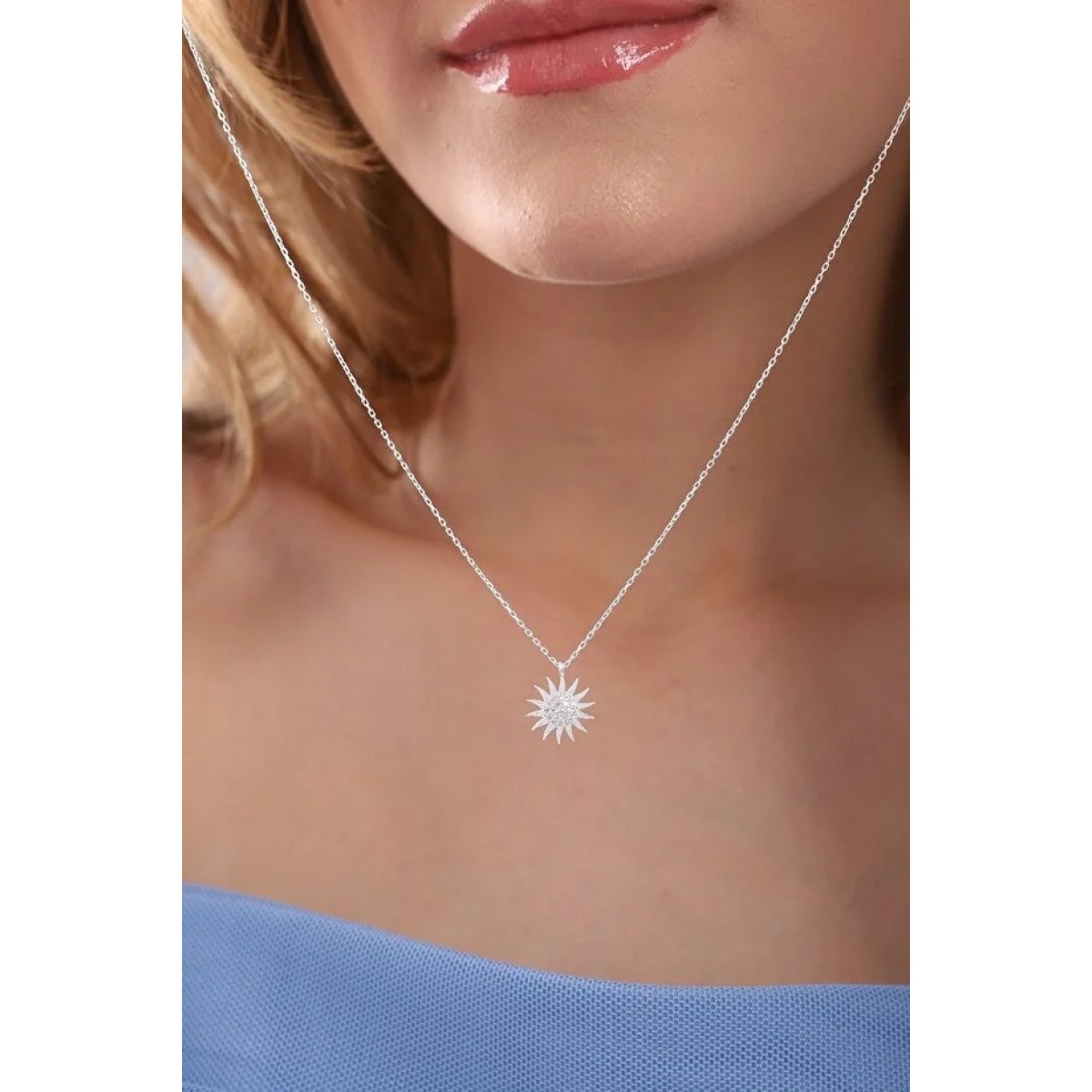 This product features a 925 sterling silver chain and a white stone sun-shaped pendant.
