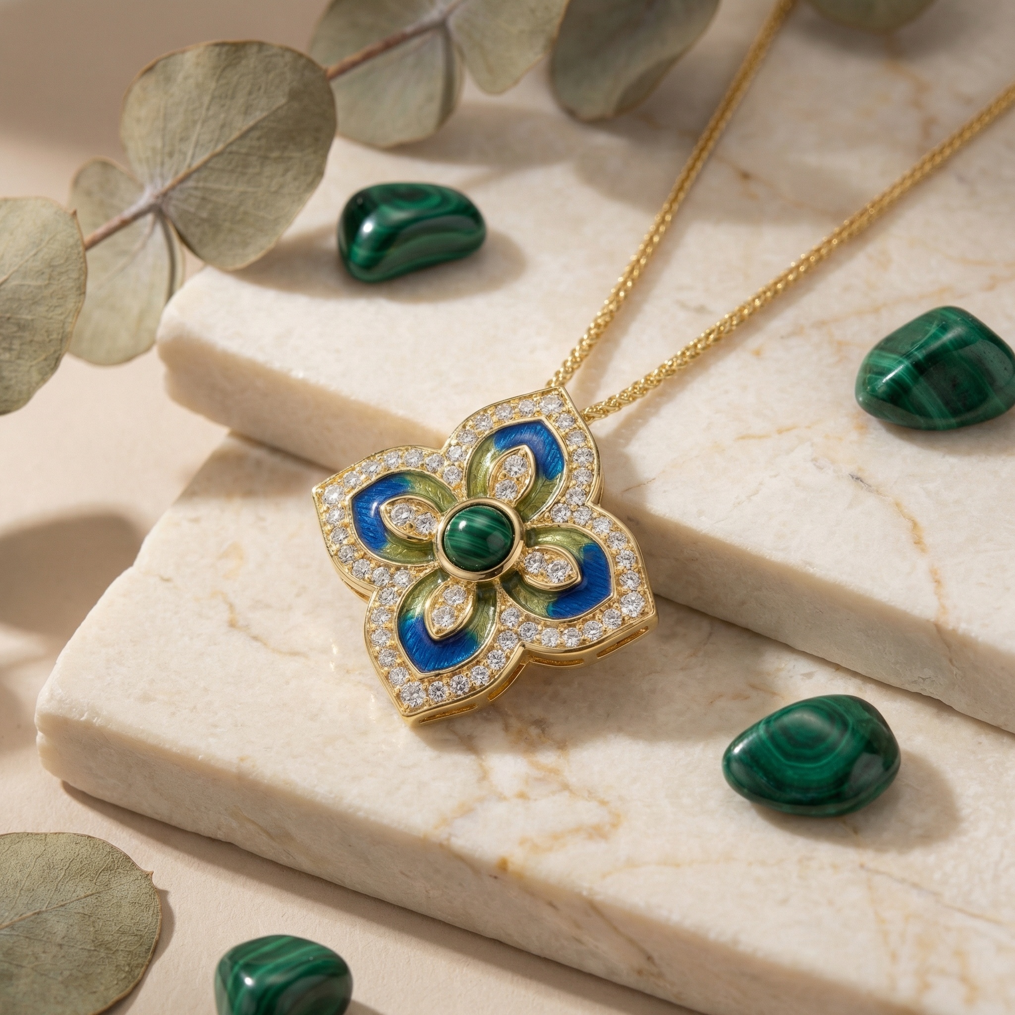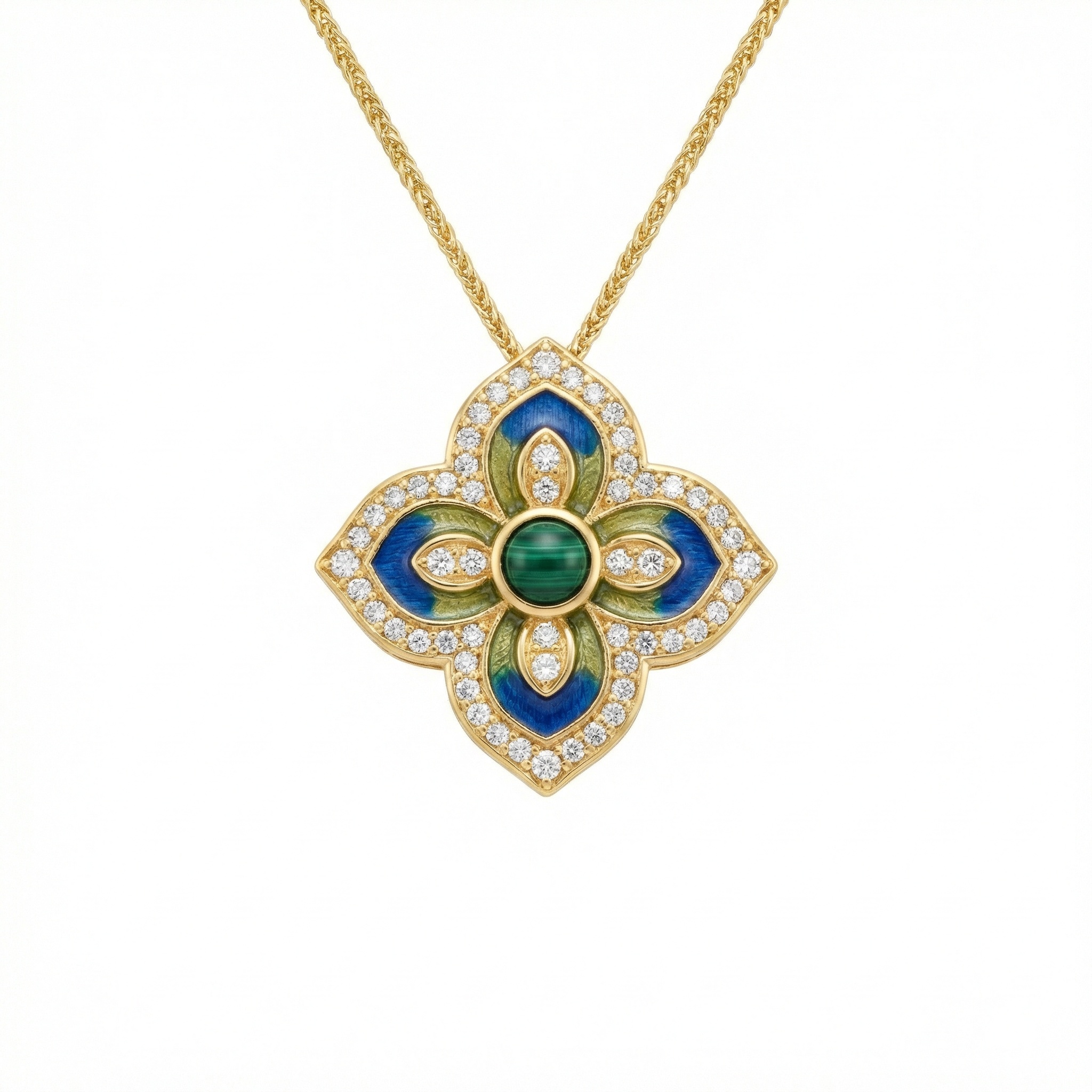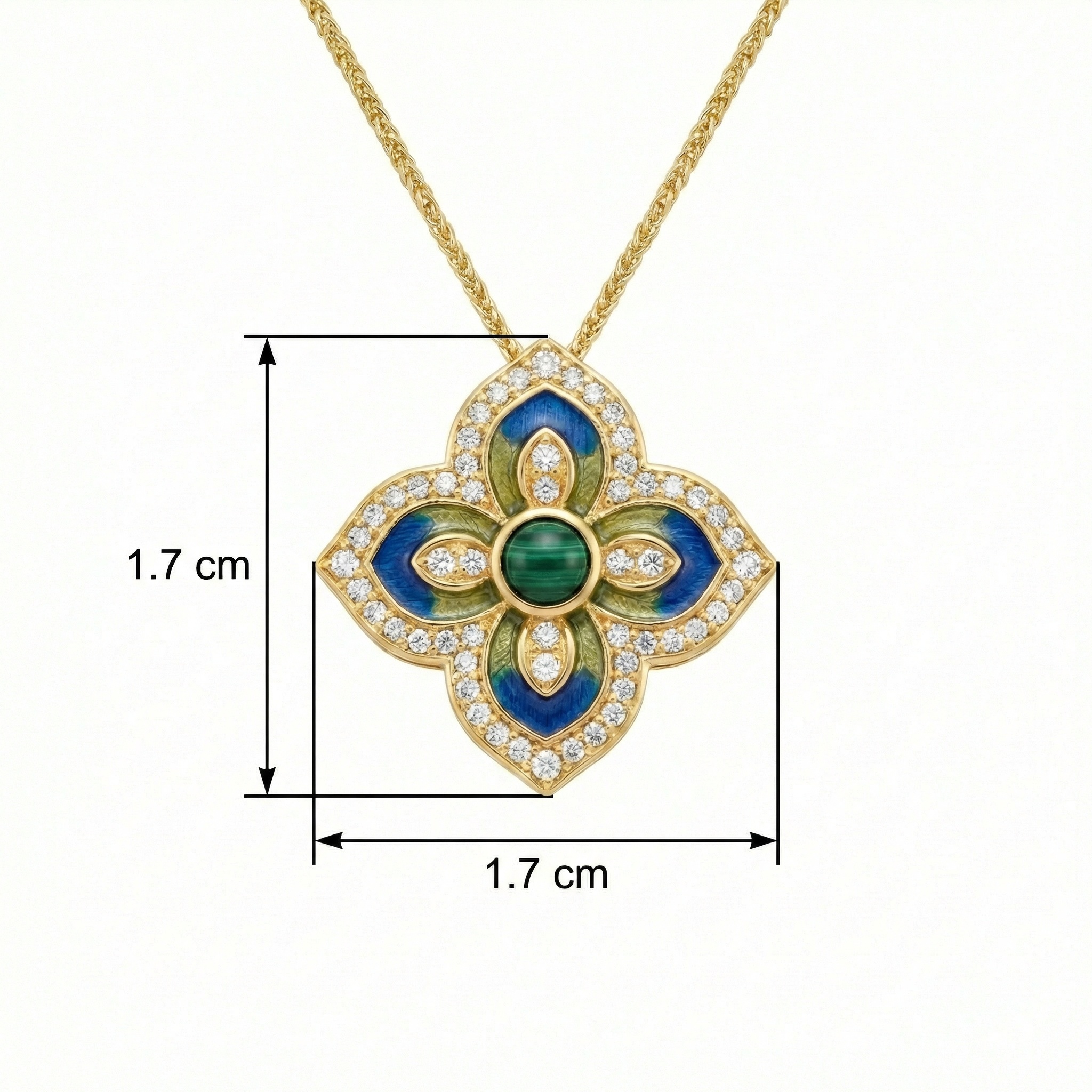 This exquisite necklace features a masterfully crafted yellow gold pendant in a sophisticated quatrefoil floral design. At its heart lies a polished green malachite cabochon, celebrated for its unique natural banding. The center is surrounded by four petals adorned with a gradient of deep blue and vibrant green enamel, creating a lush, stained-glass effect. Each petal is further detailed with inner gold segments pavé-set with shimmering diamonds. A continuous border of brilliant-cut diamonds encircles the entire piece, providing a luxurious and radiant finish. Suspended from an elegant gold wheat-style chain, this pendant blends traditional craftsmanship with timeless elegance, making it a striking statement piece for any collection. | Brand: jewelryodm