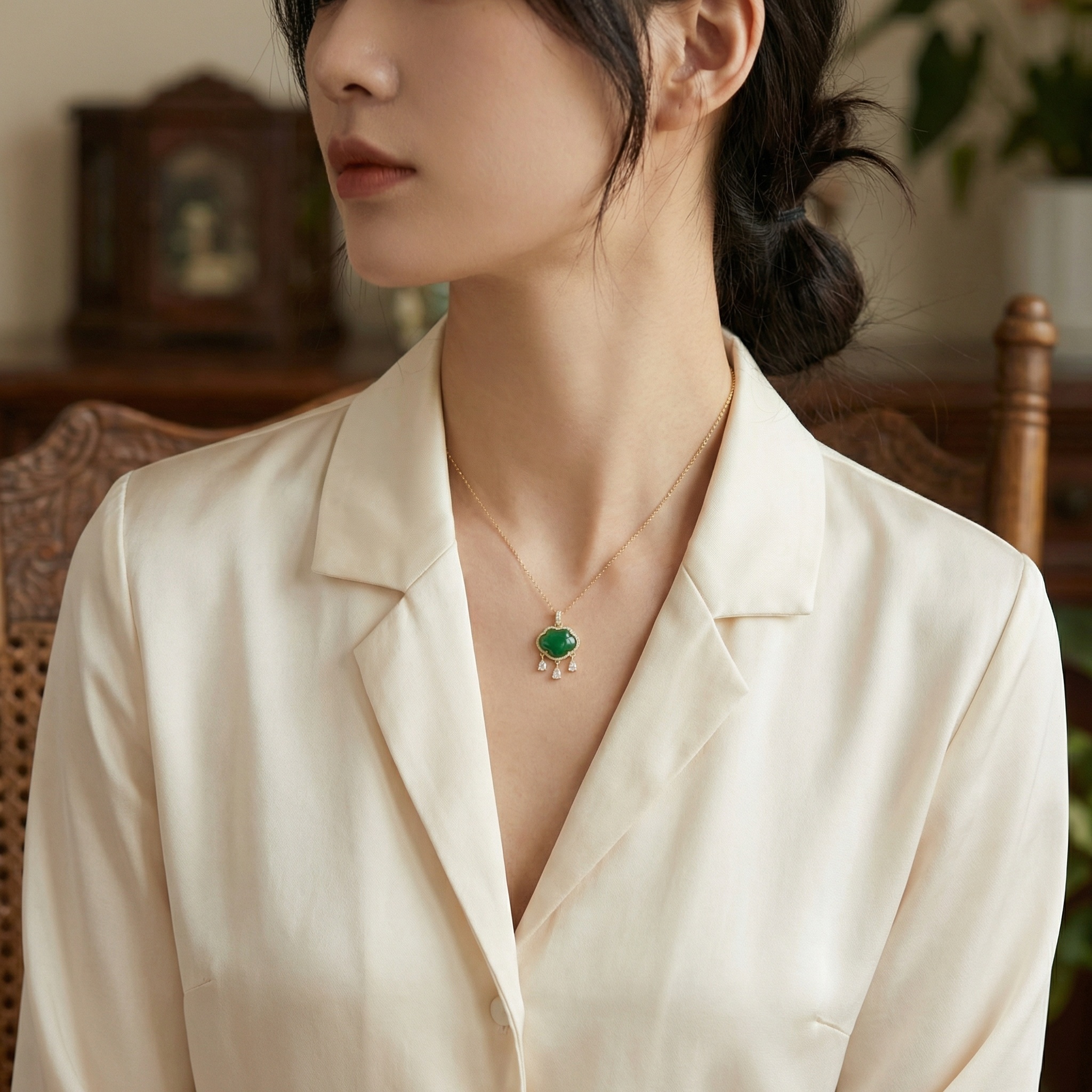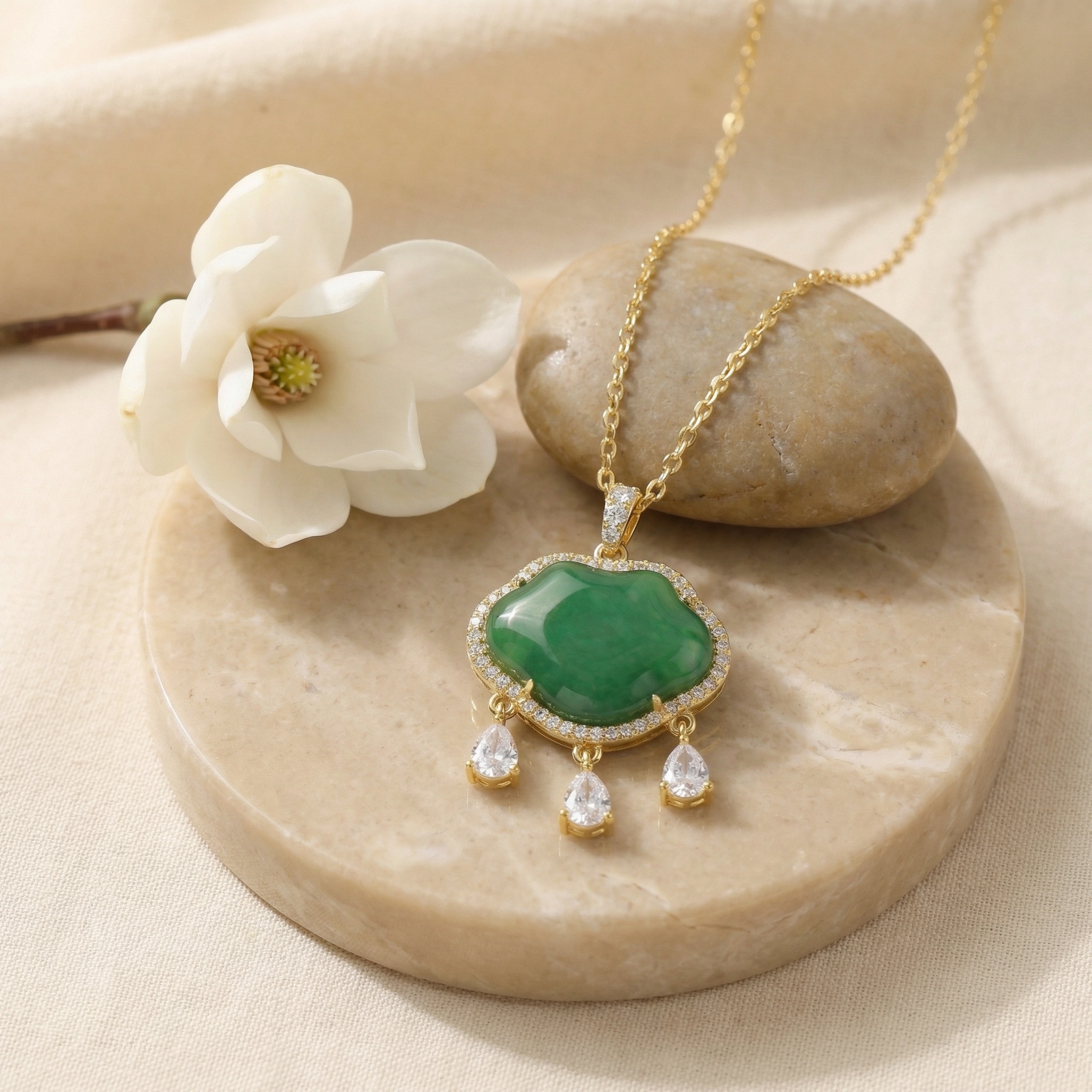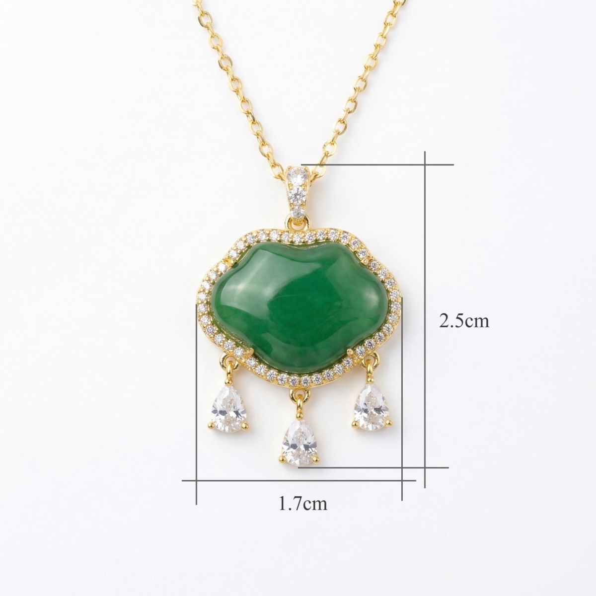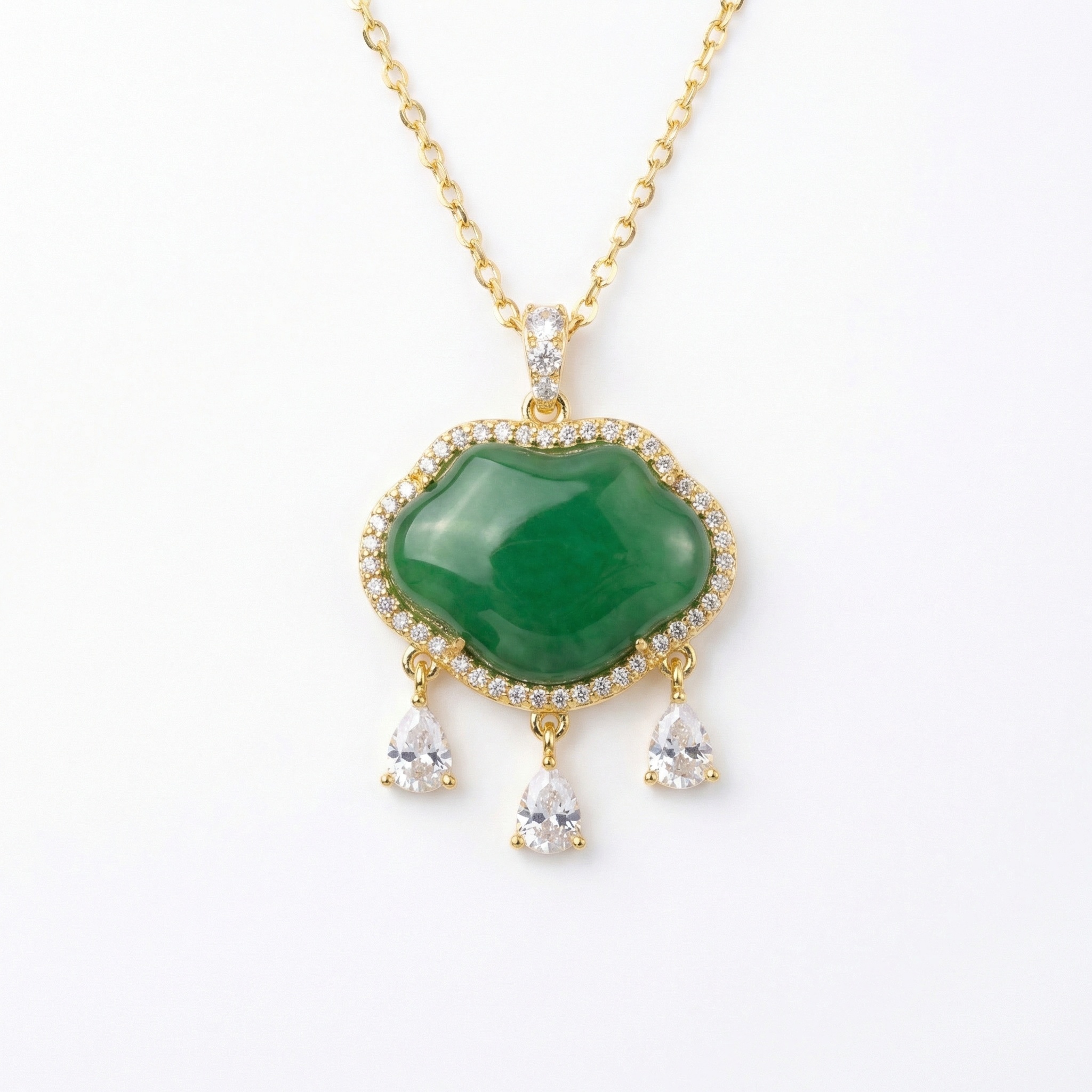 This exquisite necklace features a vibrant green jade pendant carved into a graceful cloud shape, symbolizing longevity and good fortune. The central stone is meticulously framed by a halo of brilliant clear gemstones that catch the light from every angle. Three delicate pear-shaped charms dangle from the base, adding a touch of movement to the sophisticated design. Suspended on a fine chain with a warm metallic finish, this piece blends traditional inspiration with contemporary elegance. The combination of deep green and sparkling white stones creates a striking contrast, making it a perfect statement piece for special occasions or a meaningful gift. Its timeless aesthetic and intricate craftsmanship ensure it remains a cherished addition to any jewelry collection. | Brand: jewelryodm