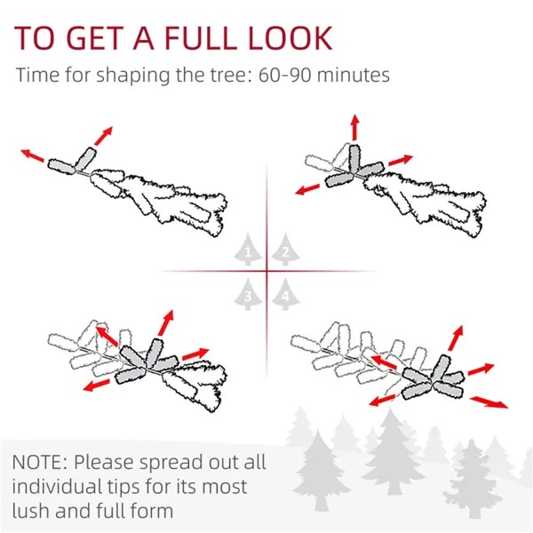 In order to get a full appearance, please spread out all individual tips to get the best possible look from the tree, suggest you take 60-90 minutes to shape the tree.