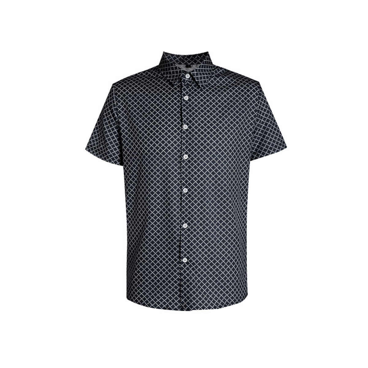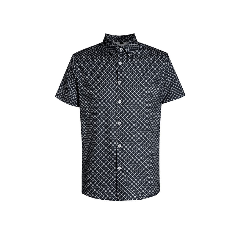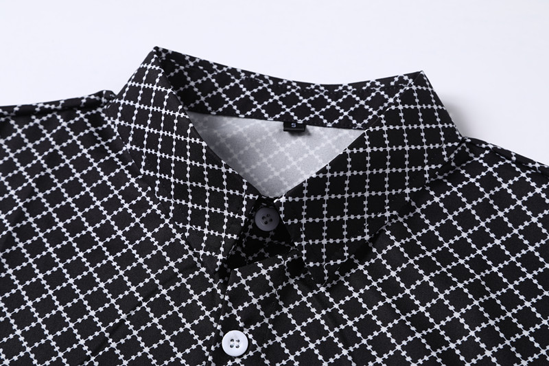 This European and American men's short-sleeved shirt is based on the classic shirt silhouette and incorporates modern design ingenuity. Selected high-quality four-sided elastic fabric endows the clothes with excellent stretchability and resilience, allowing for free movement without any constraints. It also features breathability and drape, ensuring comfort and a neat style when worn in summer. The body of the garment features a deep navy blue base color, adorned with fine geometric check patterns. It is simple yet retains the tension of details. The classic black and white color combination exudes a high-end texture, making it easy to handle various occasions. The standard lapel design is neat and stylish, with a single row of mother-of-pearl buttons as accents, highlighting exquisite taste in the details. The short-sleeved cut is refreshing and breathable, making it an essential item for summer wardrobes that combines practicality and fashion.