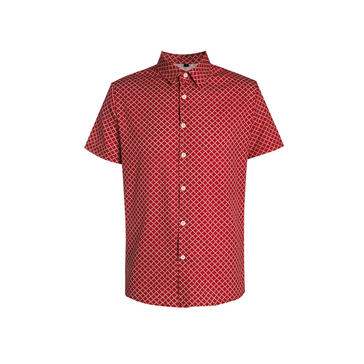 This European and American men's four-sided checkered short-sleeved shirt, with its bright red base color and white diamond-shaped print, exudes a retro modernity and vitality. It can be styled in multiple ways. Here are several core matching ideas: