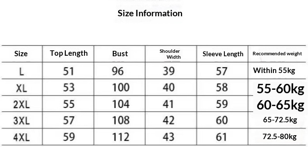 Size: L (45–55 kg), XL (55–60 kg), 2XL (60–65 kg), 3XL (65–72.5 kg), 4XL (72.5–80 kg)