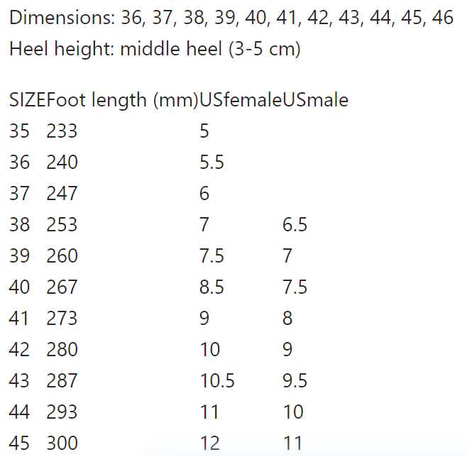 Size: 36, 37, 38, 39, 40, 41, 42, 43, 44, 45, 46