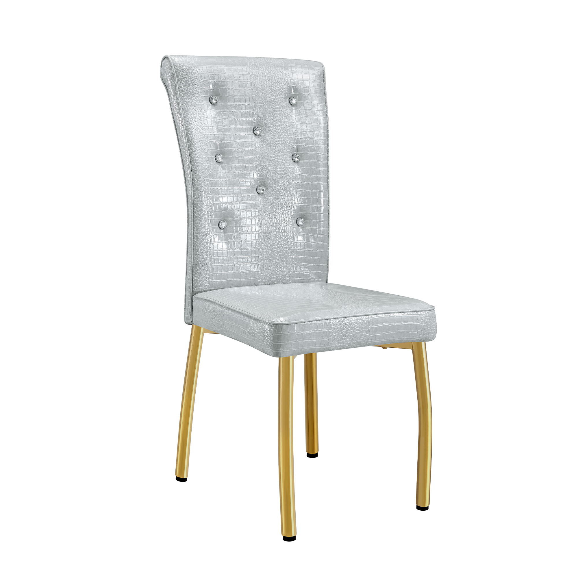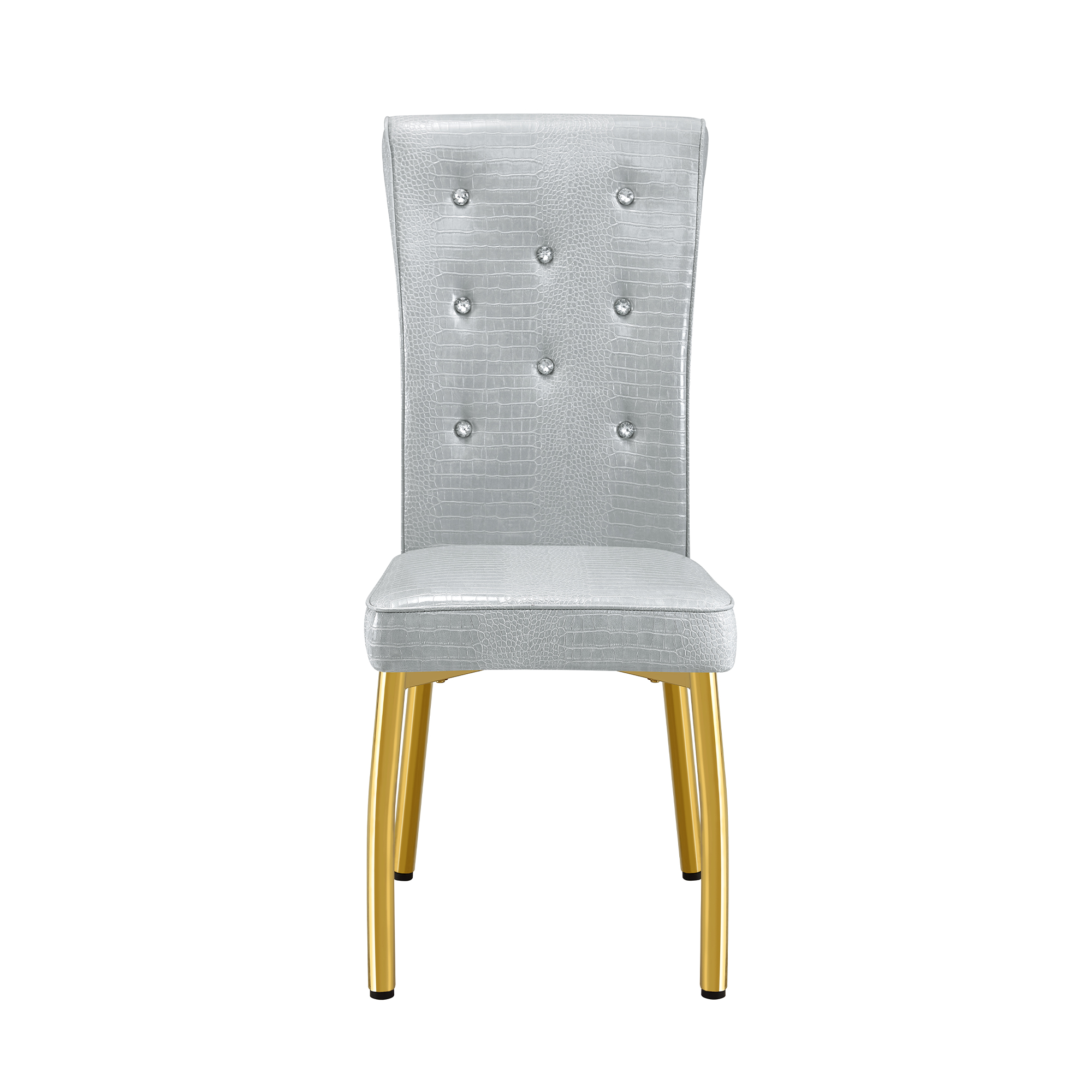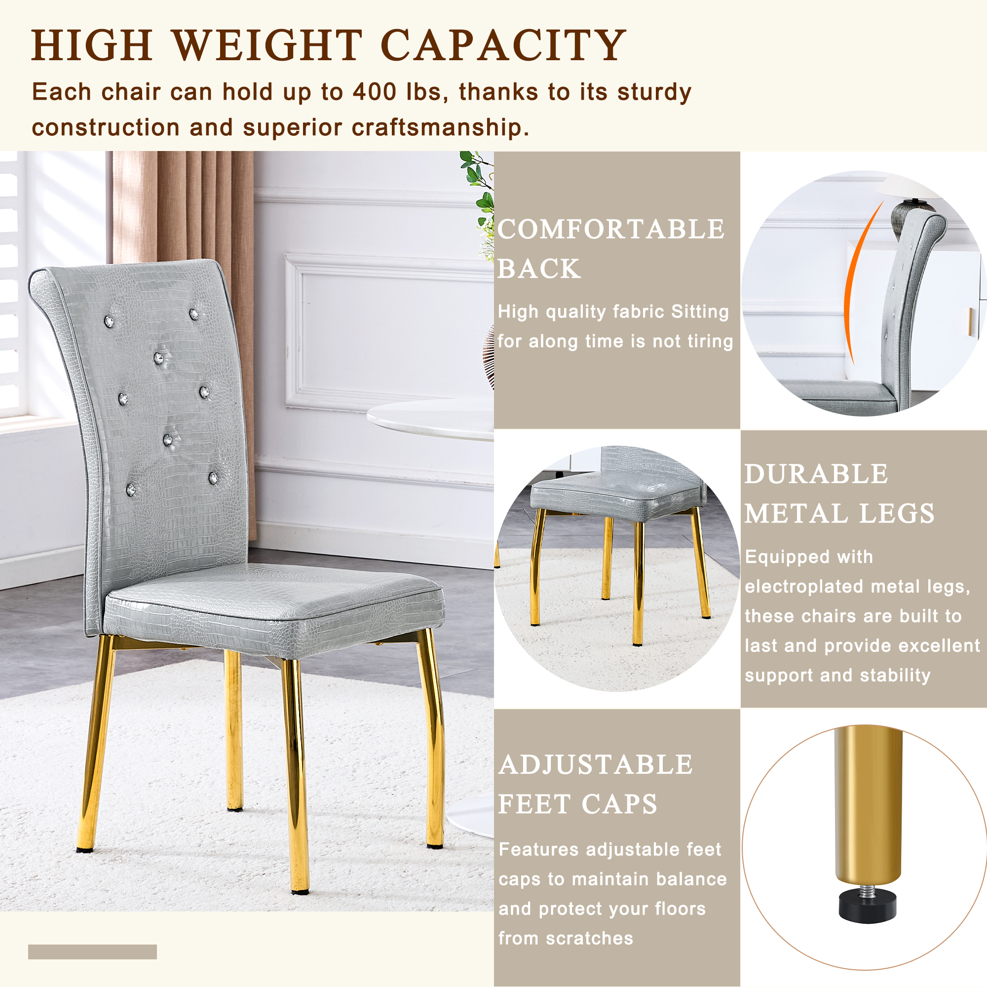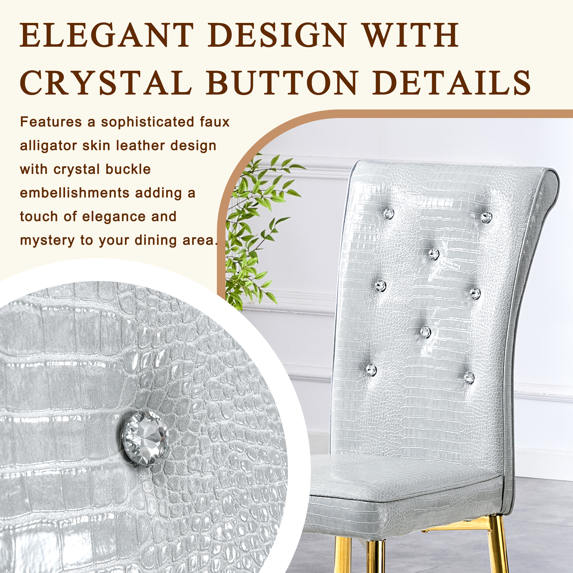 Product Name:A set of 2 gray and gold vintage crocodile leather cushioned dining chairs, featuring crystal clasp design and artificial leather design, adding a touch of elegance and mystery to the dining area