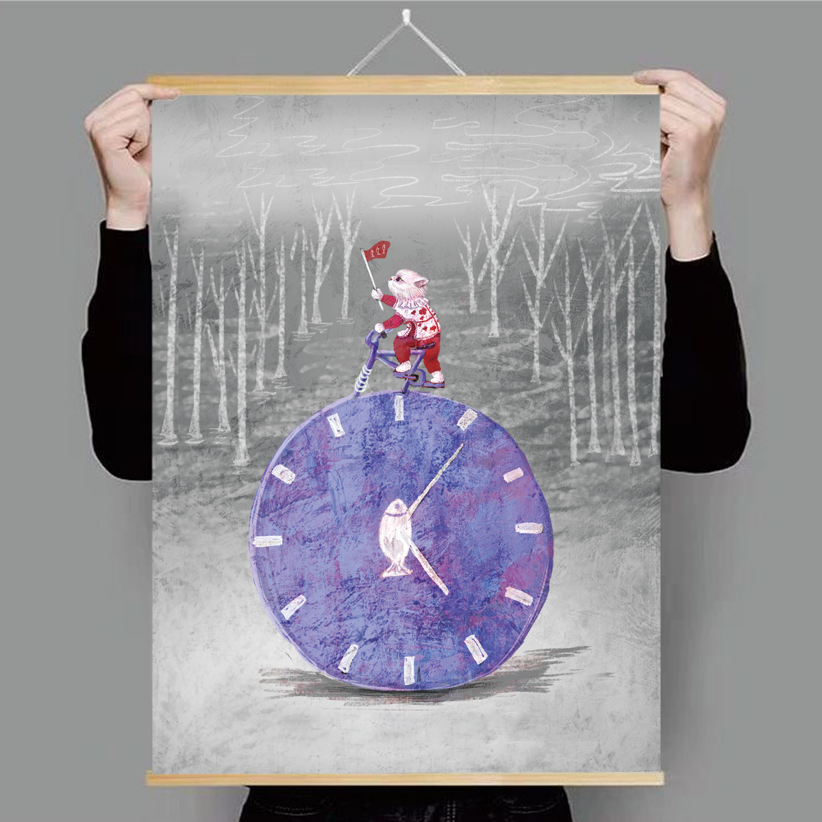 A solid wood scroll art painting,The cat riding a bike