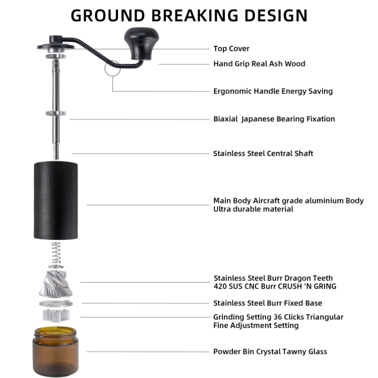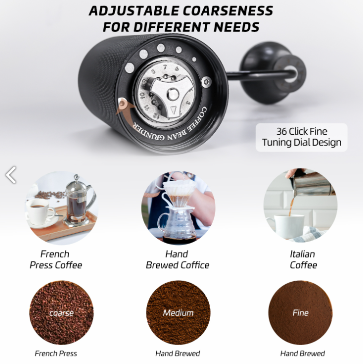 EASY TO CLEAN: Our manual coffee grinders have a special arc design at the inner bottom of the powder cup which makes it easy to clean and prevents residual powder from getting stuck in the right-angle gap. This manual coffee grinder burr can be dissembled and cleaned with a brush for more practicality.