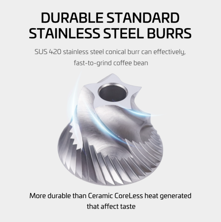 HEAVY-DUTY DESIGN MADE TO LAST: Our manual burr coffee grinder has an upgraded burr that is larger and more durable. They are coated with stainless steel, making them more resilient and corrosion-resistant. Unlike ceramic burrs, our steel ones are a lot sharper and sturdy, managing to grind coffee beans quickly and efficiently.