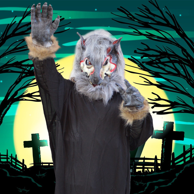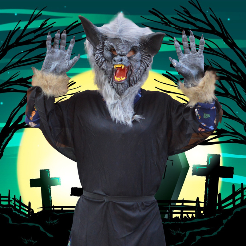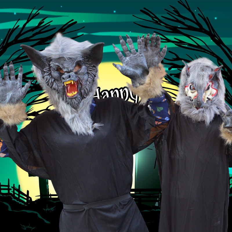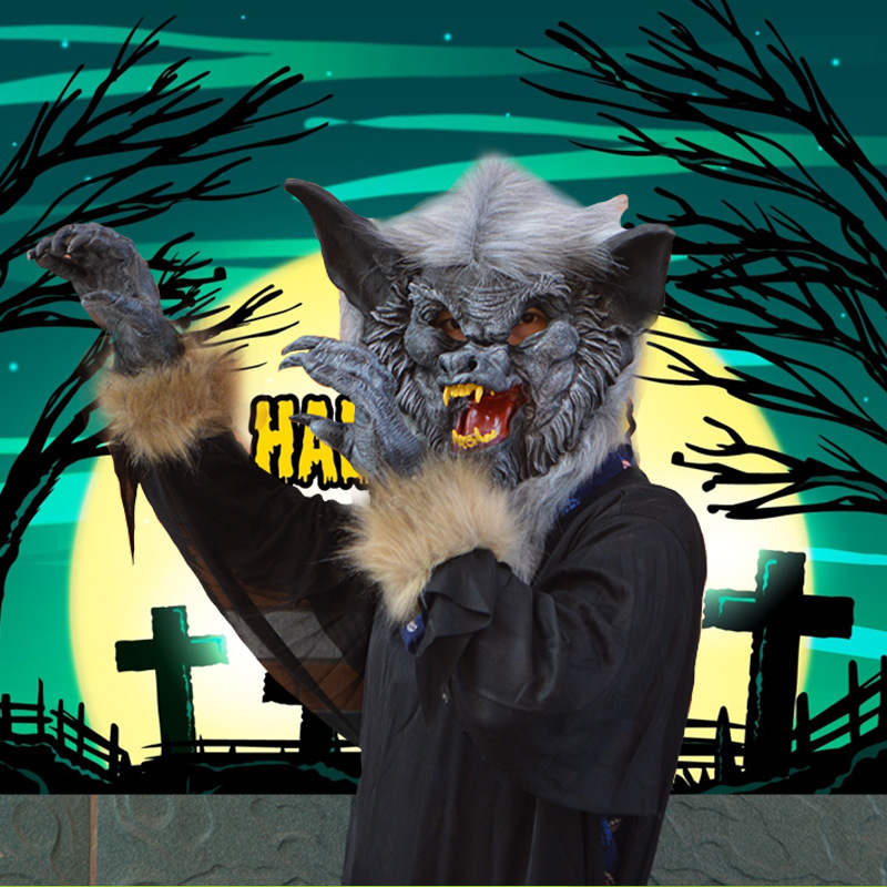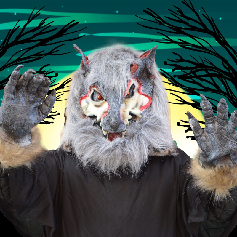 Modelling: pure black face takes mask of hair Wolf head, black and white red face takes mask of hair Wolf head, honing out masking tape wool Wolf glove, pure black sex manikin