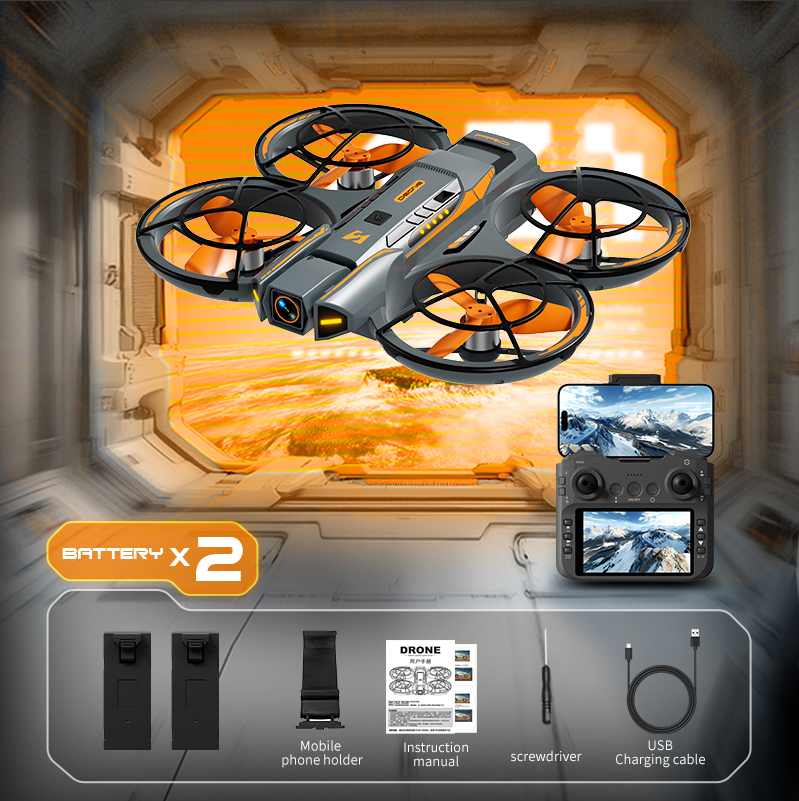 Product Description Take your aerial photography and fun to new heights with our 2025 Mini Drone with HD Camera. Designed for both kids and beginners, this compact quadcopter combines ease of use with impressive features, making it the perfect introduction to the world of drones. Key Features: 1080P HD Camera: Capture stunning photos and videos from the sky, and enjoy real-time FPV (First Person View) streaming to your smartphone or the included remote control with an LCD screen. Double Flight Time: Comes with 2 rechargeable batteries, providing up to 20 minutes of total flight time, so you can spend less time charging and more time flying. User-Friendly Controls: Intuitive remote control with one-key takeoff/landing, altitude hold, and headless mode make it incredibly easy for anyone to master, even first-time pilots. Safe & Durable Design: Equipped with protective propeller guards to prevent damage and ensure safe operation, especially for younger users. Fun Flight Modes: Perform exciting 360° flips and rolls with the push of a button, adding an extra layer of excitement to your flights. Complete Package: Includes everything you need to get started: 2 batteries, a mobile phone holder, an instruction manual, a screwdriver, and a USB charging cable. Whether you're looking for a fun toy for your child or a portable drone for your own adventures, our Mini Drone is the ideal choice. It's not just a drone; it's a gateway to endless aerial exploration.
