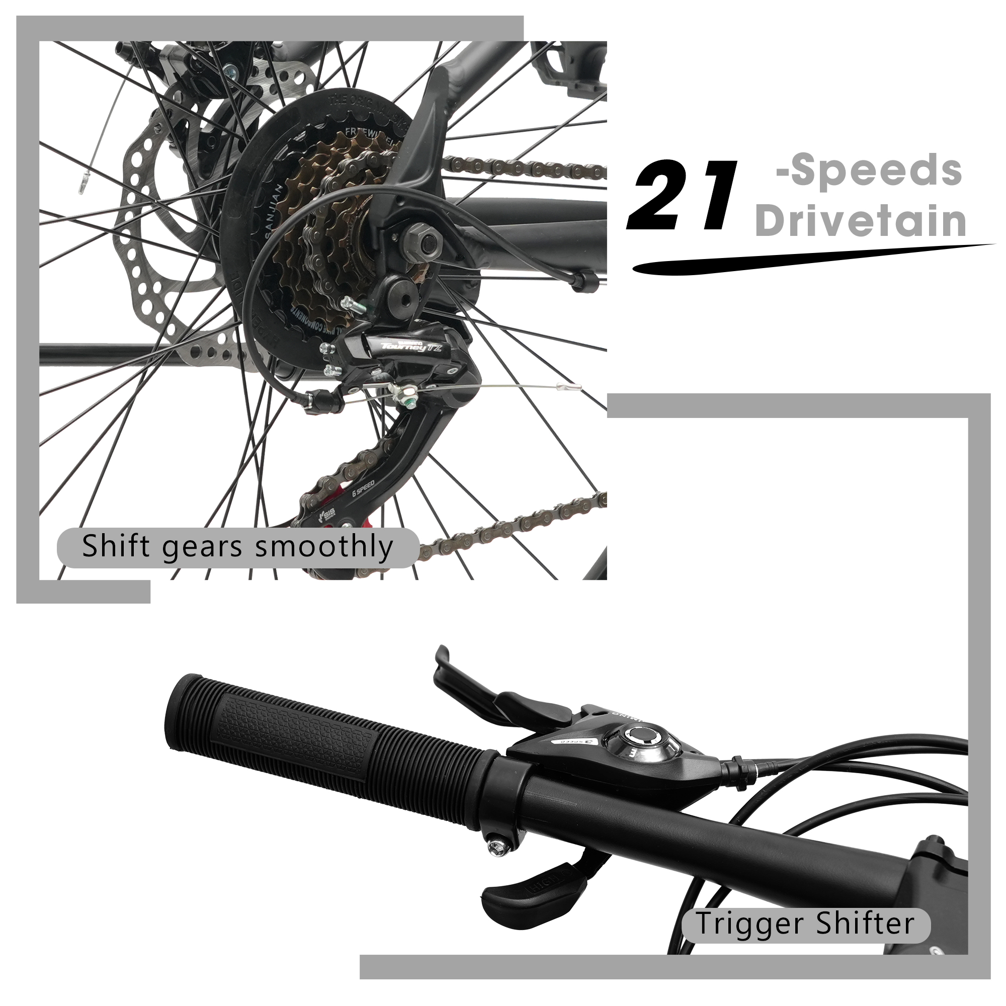 【21-Speed Gear System to Tackle Various Terrains】The 21-speed gear system allows riders to easily adjust the gears based on terrain and personal preference, improving riding efficiency and enjoyment.