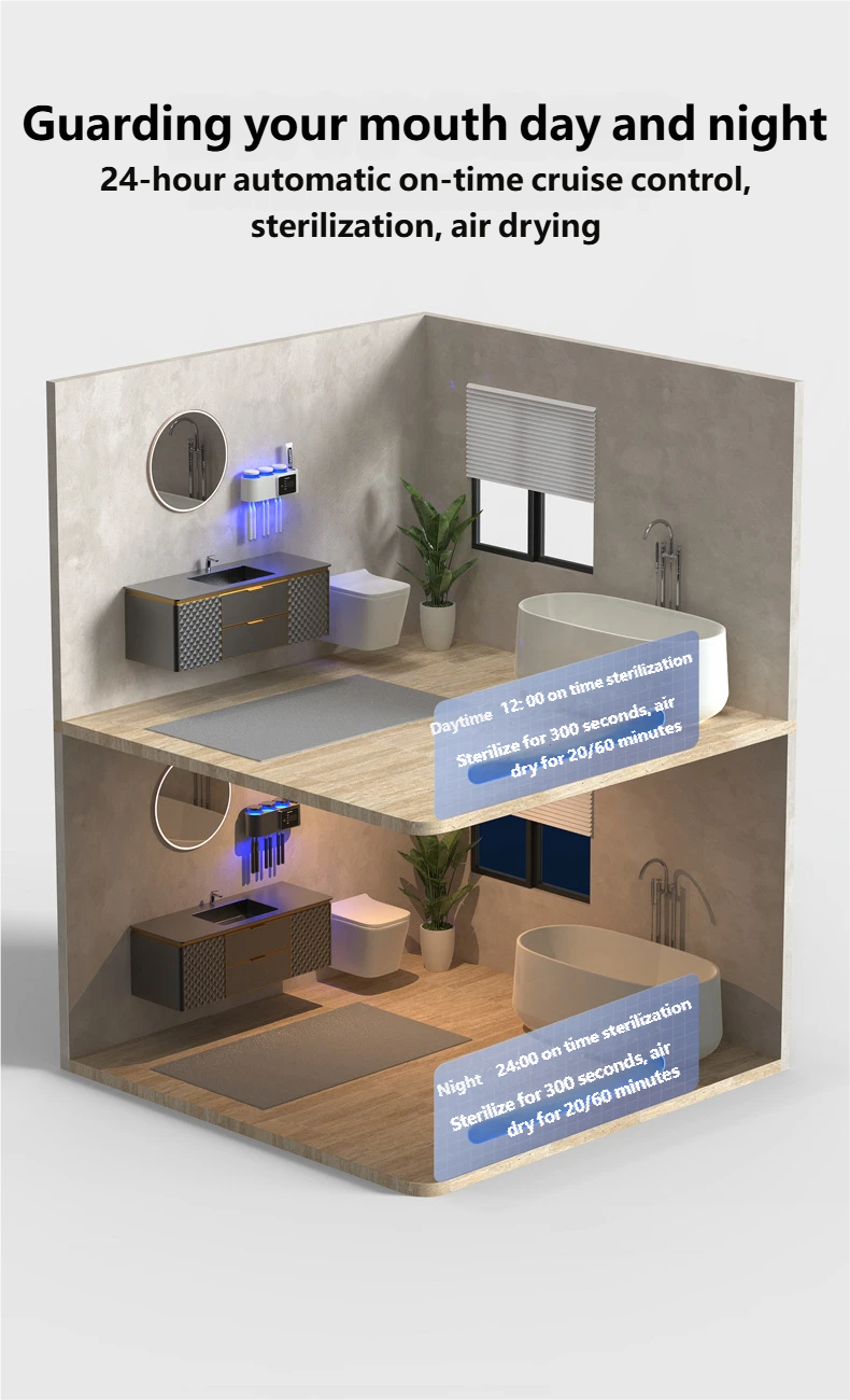 24H Smart Cruise Mode: Supports automatic 24-hour scheduled sterilization. It automatically activates at 12:00 PM and 12:00 AM (180s sterilization + 20/60min drying), providing round-the-clock oral care without manual intervention.