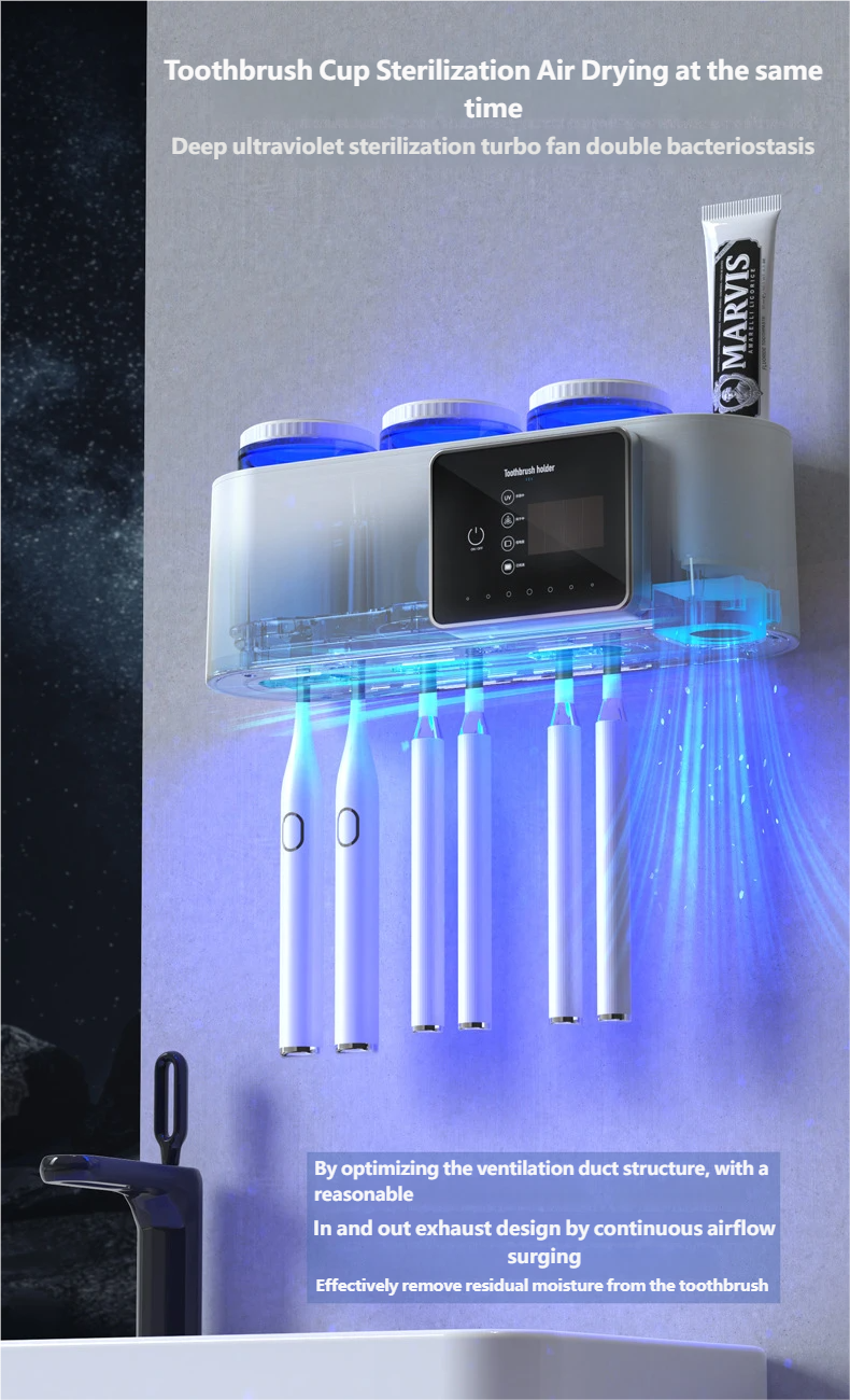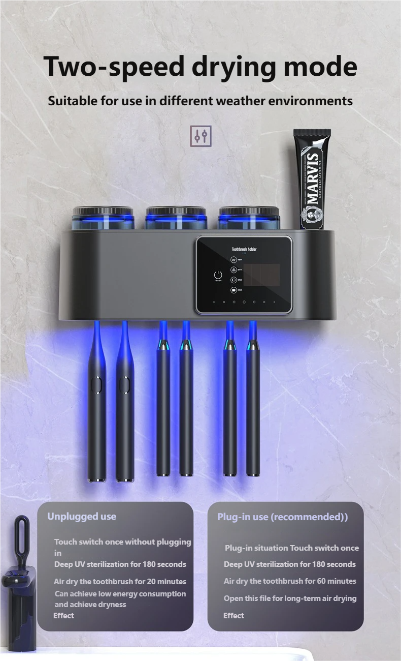 Deep UV Sterilization + Turbo Drying: Utilizes 270NM deep ultraviolet light combined with a turbo fan for dual antibacterial action. It sterilizes both toothbrushes and cups simultaneously, effectively destroying bacterial DNA. Two drying modes (20min/60min) adapt to various humidity levels.