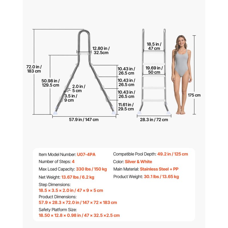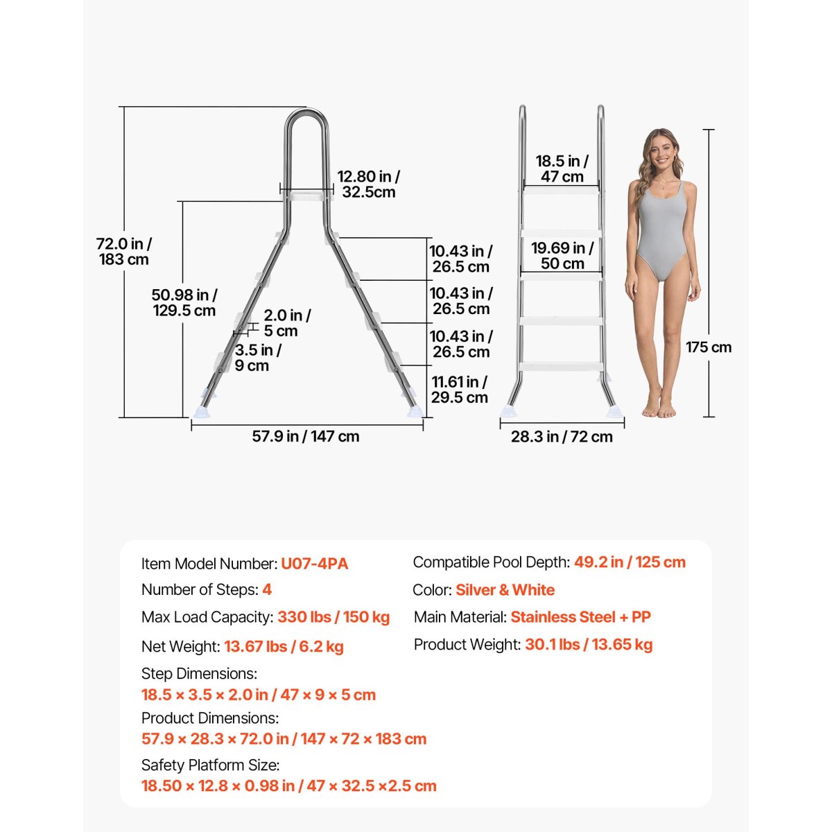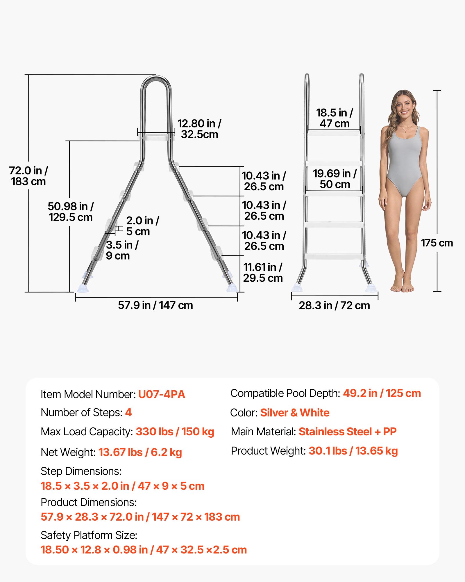 Fit Above-Ground Swimming Pools: This above ground pool ladder is compatible with 49.2 in above-ground swimming pools and performs better on flat, level surfaces for enhanced stability and secure everyday use