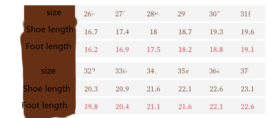 Size: 26 yards in length 16.7 suitable for foot length 16.2, 27 yards in length 17.4 suitable for foot length 16.9, 28 yards in length 18.0 suitable for foot length 17.5, 29 yards in length 18.7 suitable for foot length 18.2, 30 yards in length 19.3 suitable for foot length 18.8, 31 yards inner length 19.6 suitable for foot length 19.1, 32 yards inner length 20.3 suitable for foot length 19.8, 33 yards inner length 21.9 Suitable for foot length 20.4, 34 yards inner length 21.6 suitable for foot length 21.1, 35 yards inner length 22.1 suitable for foot length 21.6, 36 yards inner length 22.6 suitable for foot length 22.1, 37 yards Inner length 23.1 suitable for foot length 22.6