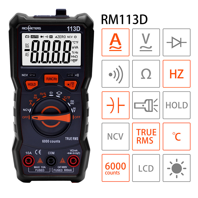 Measuring functions: capacitance, battery, resistance, DC current, AC current, AC voltage, DC voltage, temperature, lighting