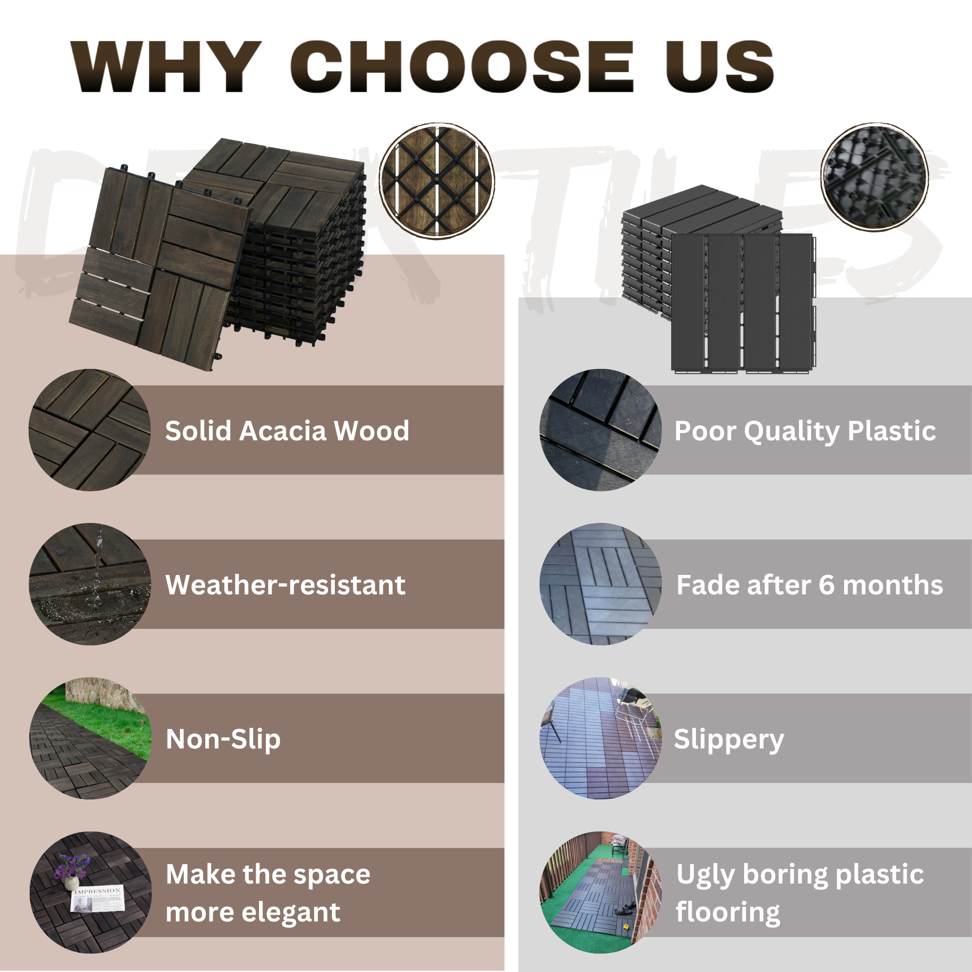 Product Name:Acacia Wood Interlocking Deck Tiles Checker Pattern, 10PCS 12" x 12" Square Dark Brown Acacia Hardwood Outdoor Flooring for Patio, Bancony, Pool Side,...