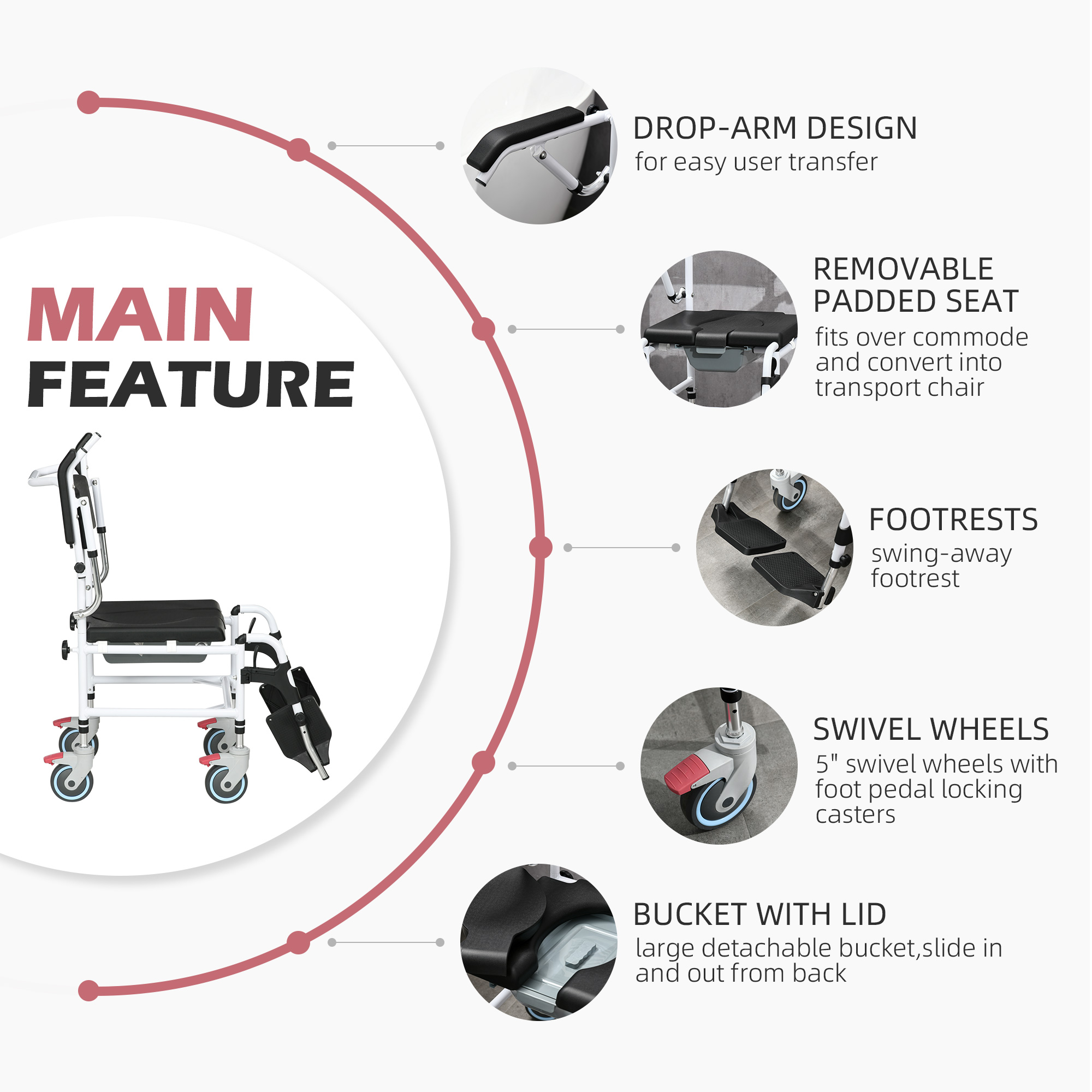 - Mobility Helper: Focusing on comfort, this wheelchair makes showering and self-care more accessible. It was designed for the elderly or disabled to assist in mobility and transportation throughout your home.