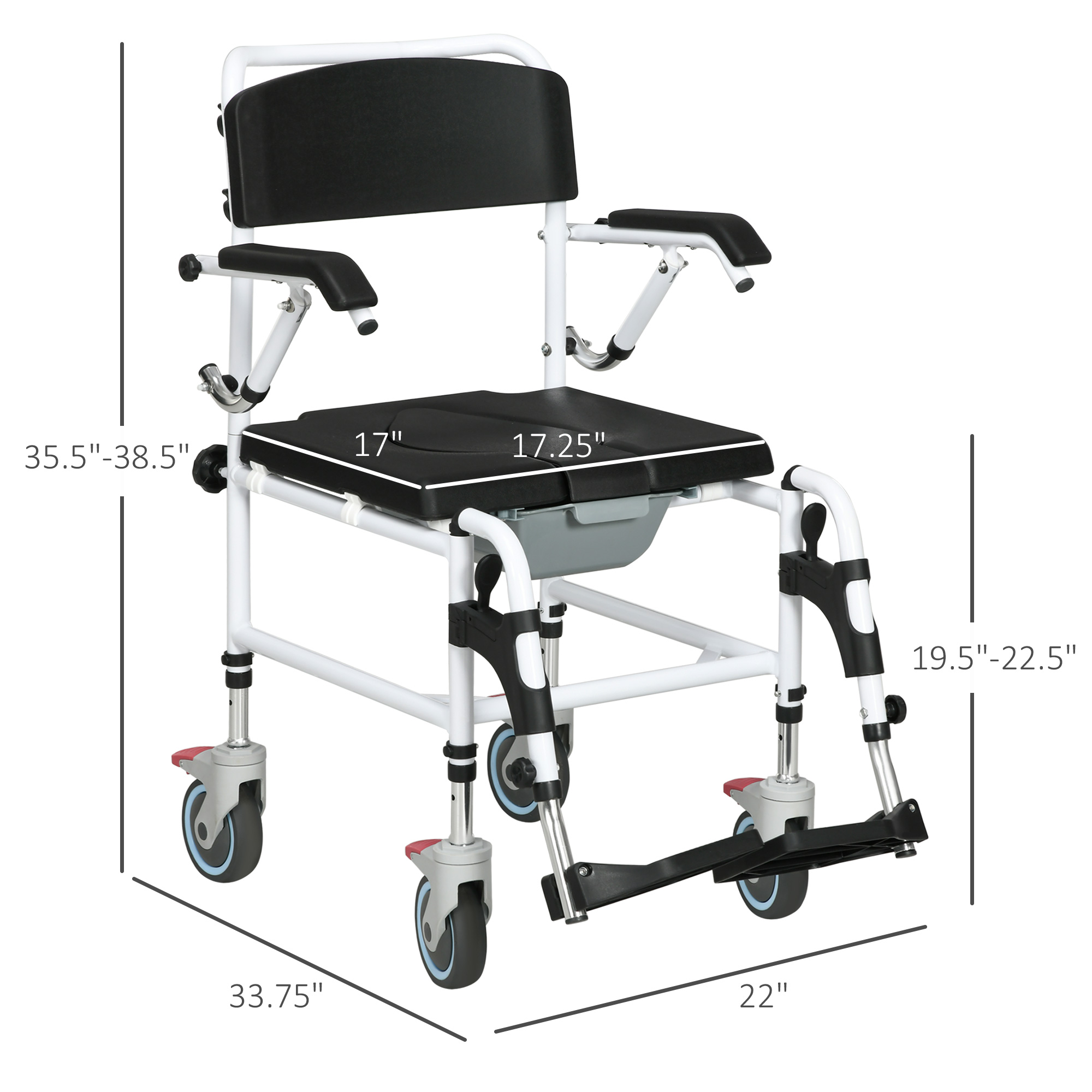 Accessibility Commode Wheelchair, Rolling Shower Wheelchair With 4 Castor Wheels, Rectangle Detachable Bucket, & Waterproof Design, 17" Seat Width, Black