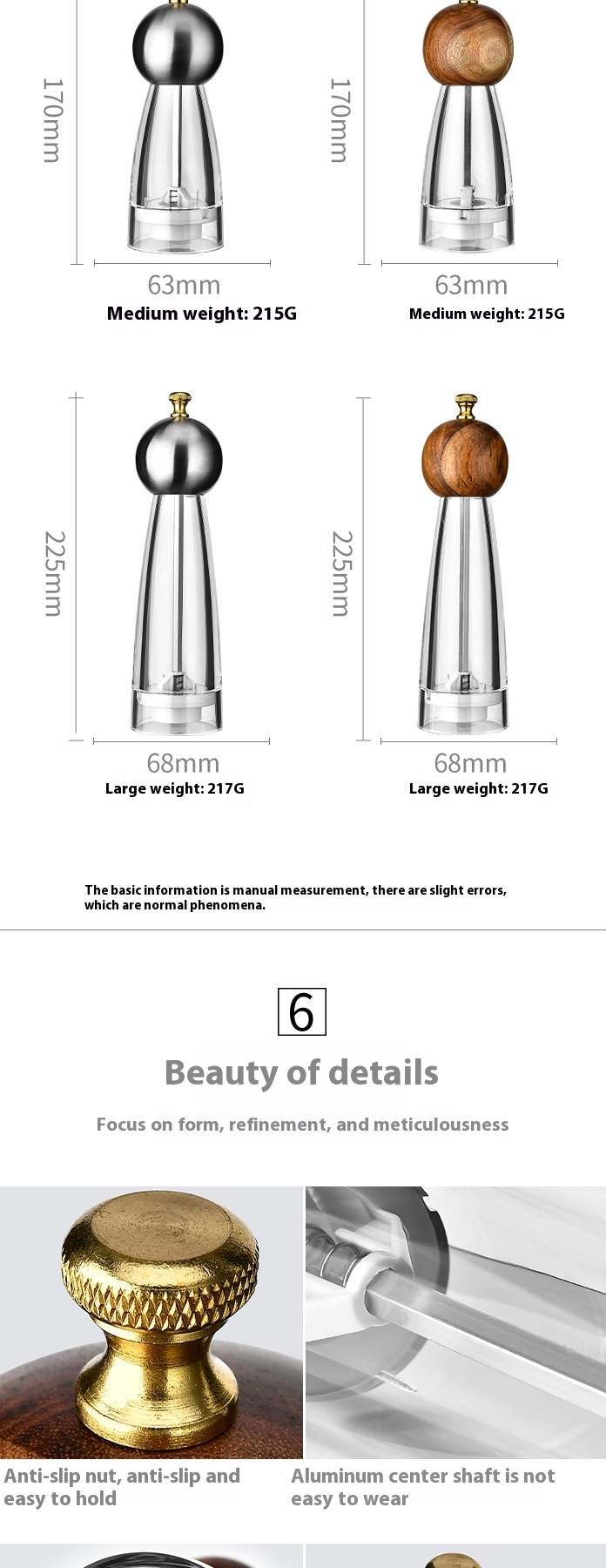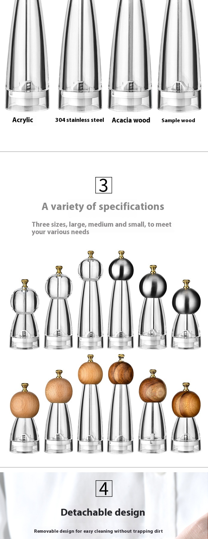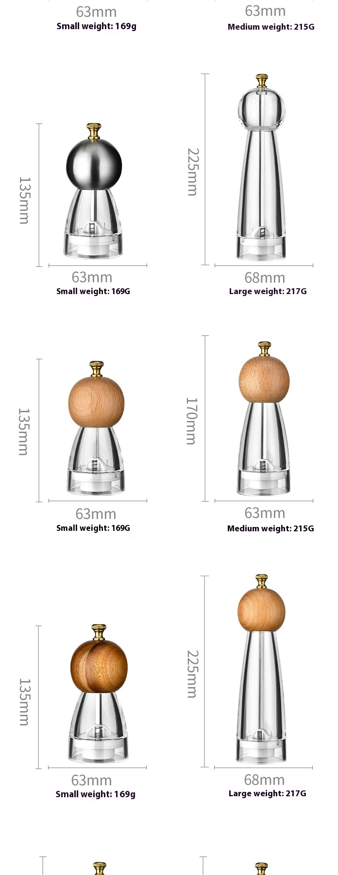 Specifications: 5-inch acrylic, 6-inch acrylic, 8-inch acrylic, 5-inch stainless steel, 6-inch stainless steel, 8-inch stainless steel, 5-inch Beech, 6-inch Beech, 8-inch Beech, 5-inch Beech, 6-inch Beech, 8-inch Beech