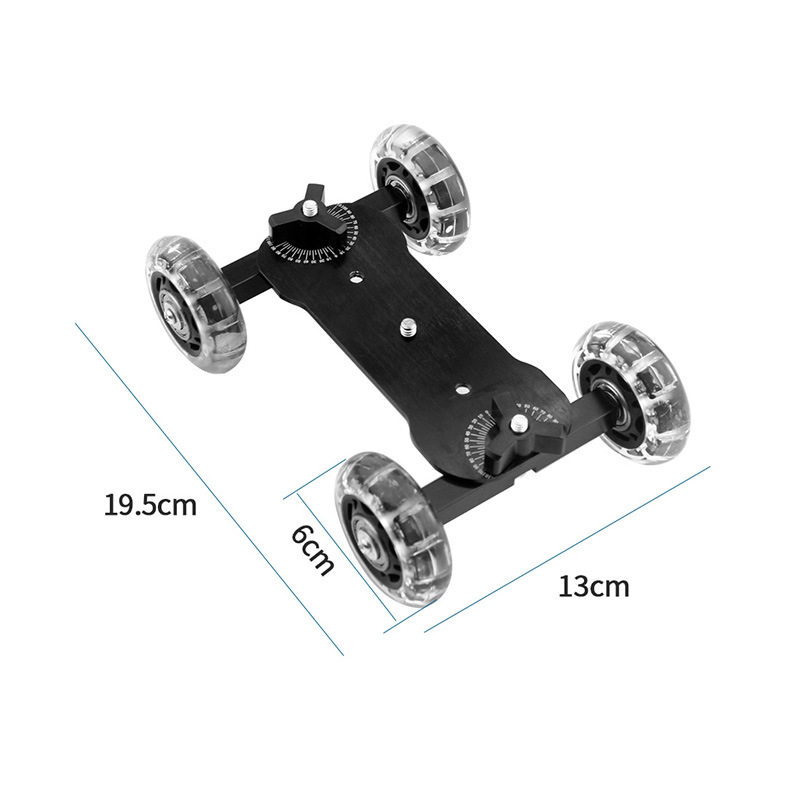 Desktop directional pulley The tires of the shooting trolley are hollowed out and outsourced with shock-proof soft rubber, so that the shooting picture is stable and does not jump, and it will not change the route during shooting. It can be freely set in a straight line or can be oriented at a maximum angle of 45 left and right. The gimbal can be installed, and there are 3 standard 1/4 screw interfaces designed on the trolley plate, which is easy to install the strange hand bracket, small gimbal, boot seat, etc., making it easier to connect with peripheral accessories such as cameras, photography lights, LCD screen, etc.