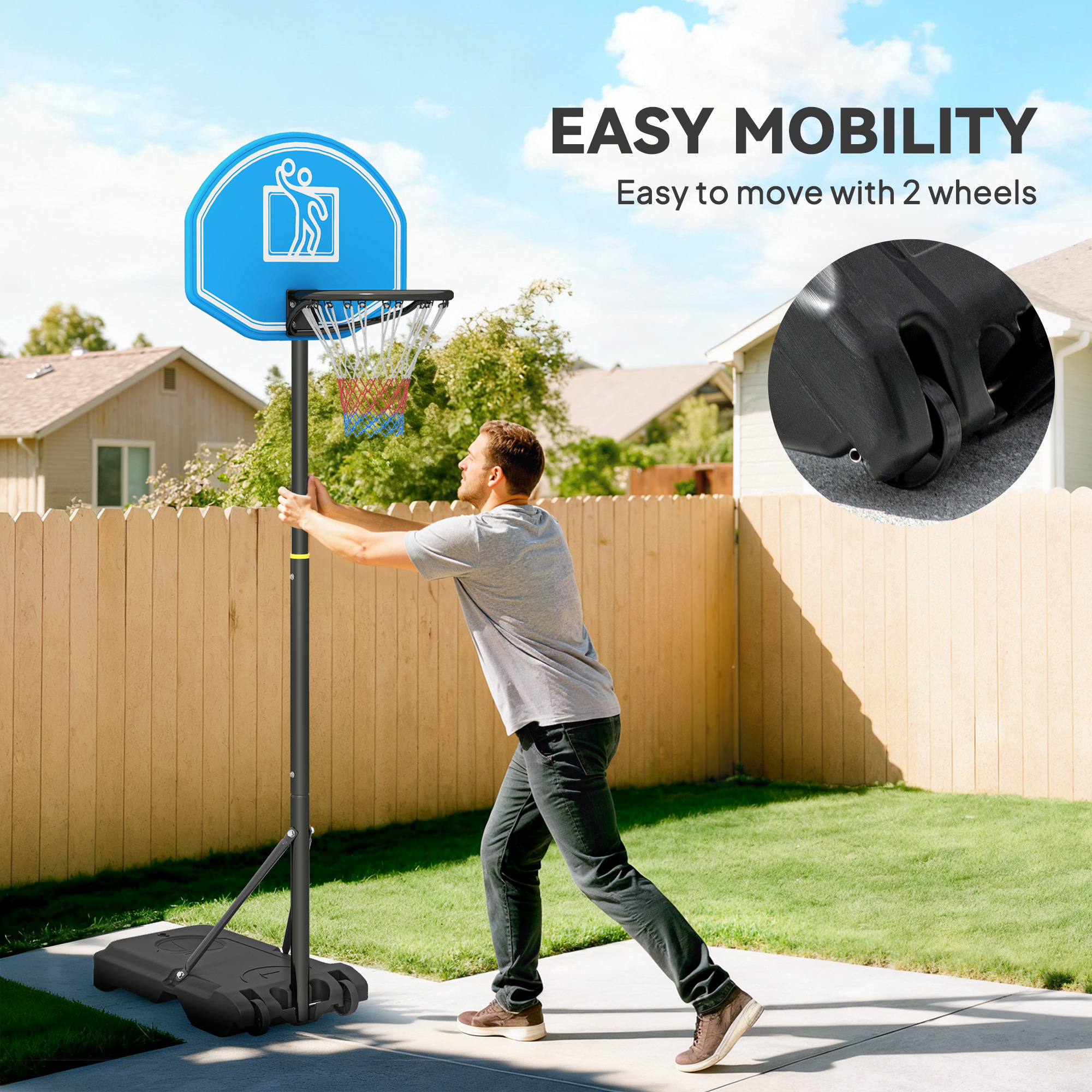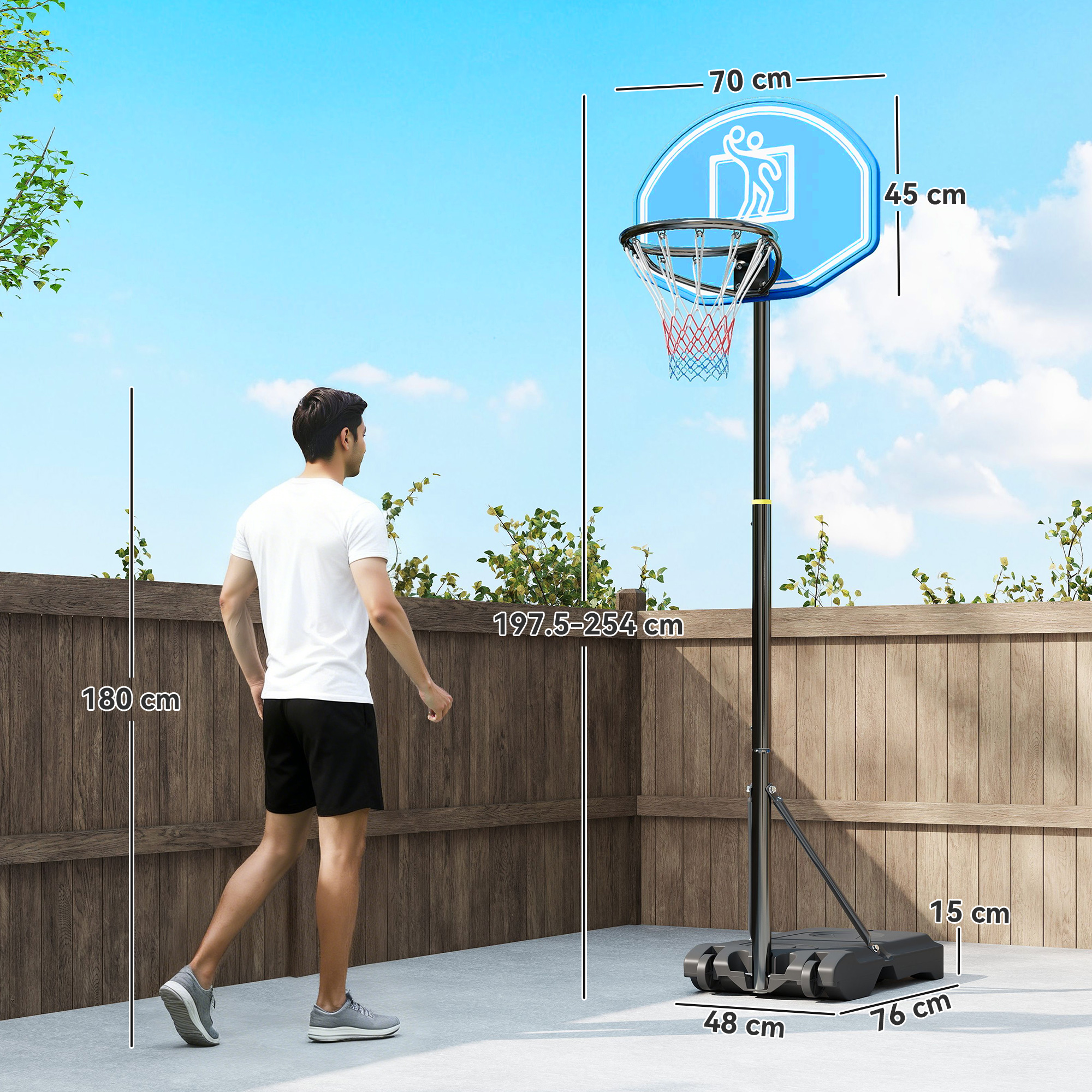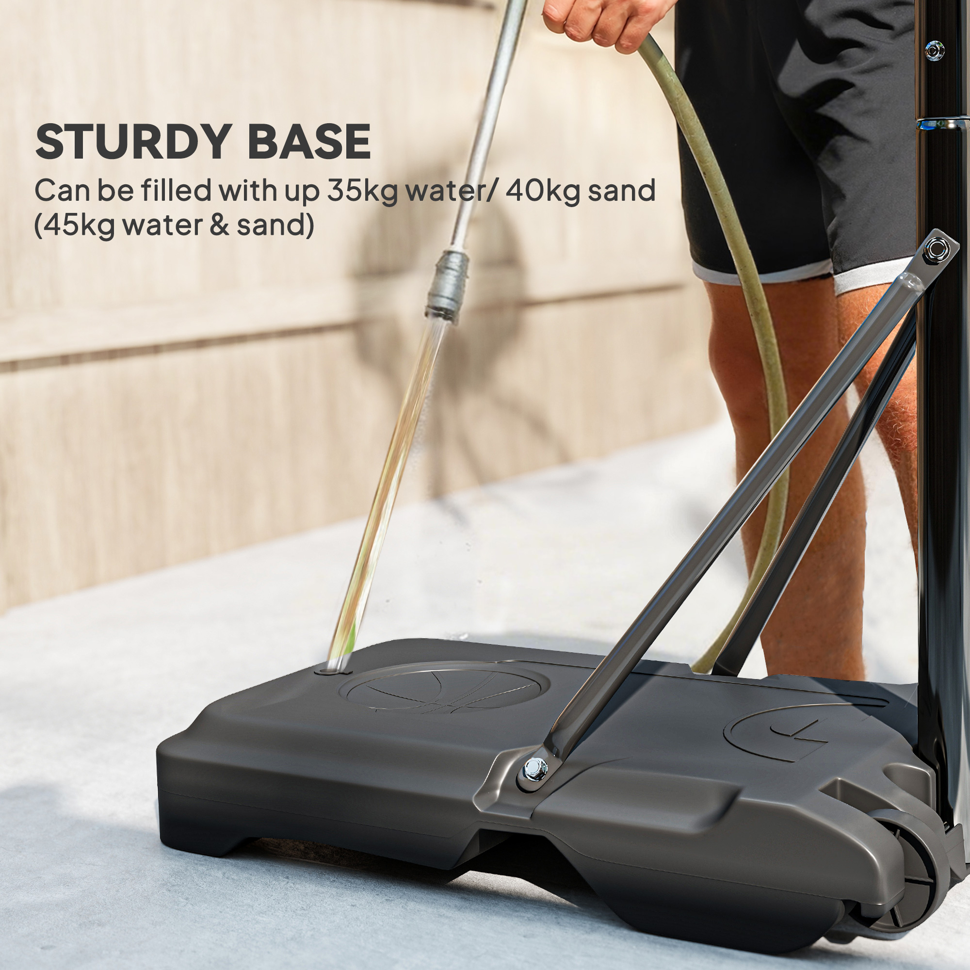 Enjoy shooting hoops with the basketball stand. The solid steel frame is adjustable between 195-245cm, making it suitable for various heights and ages. The hoop is also adjustable between 160-210cm. Fill the large base with water or sand to keep it firmly upright during sessions. It has two wheels at the bottom for easy movement, complete with a ball-holding groove at the back to keep your ball safe and in place when not in use.