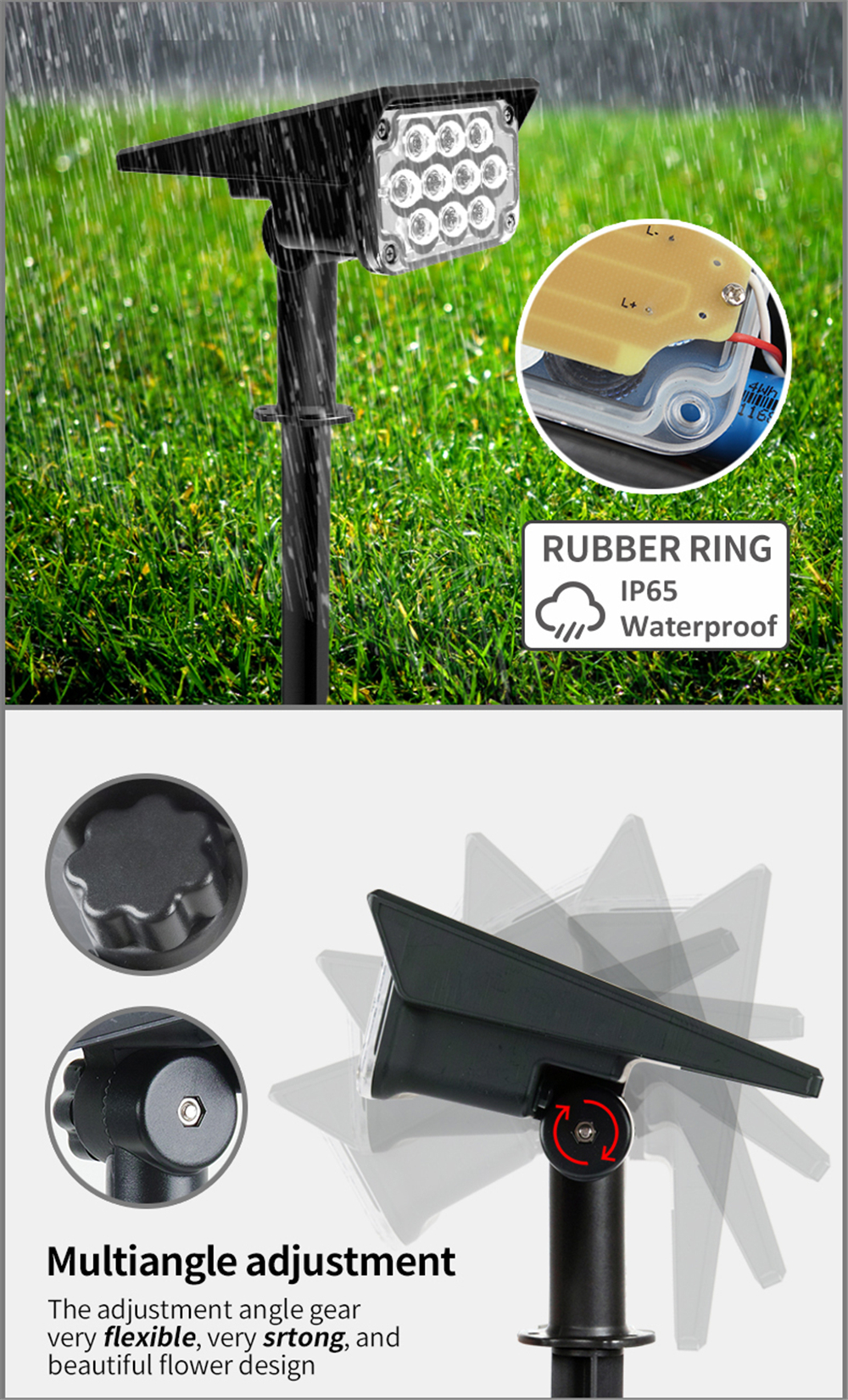 Function: Light control, the solar panel charges the battery during the day and lights automatically at night.