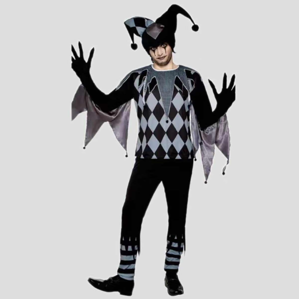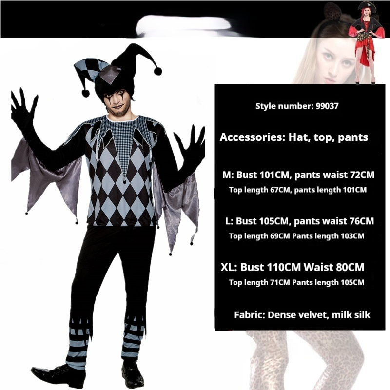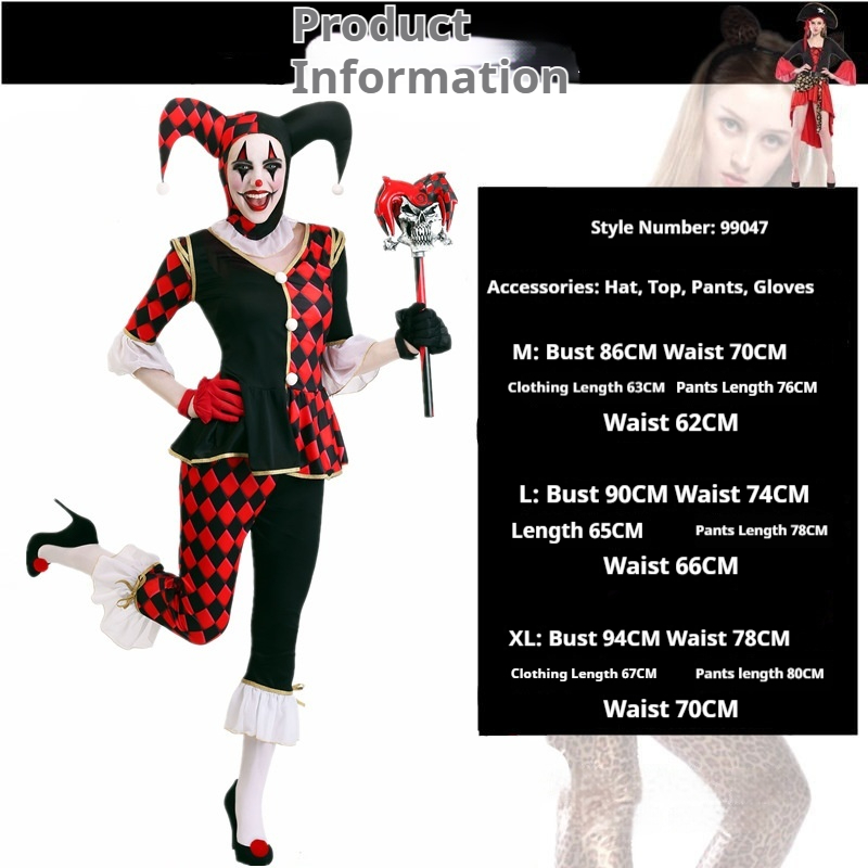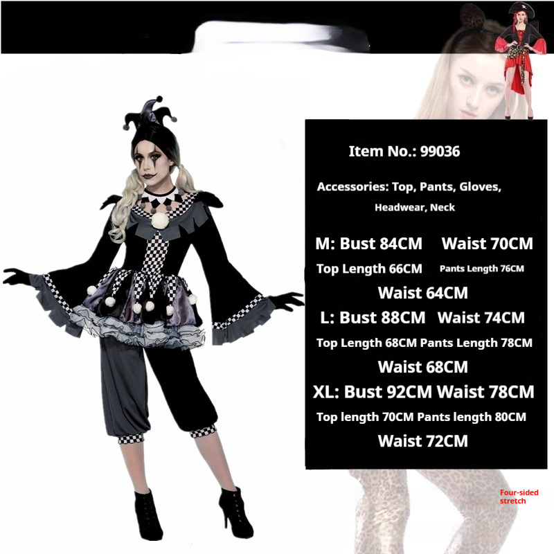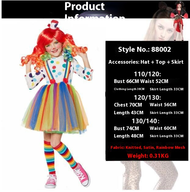 Color: Black clown girl, black clown man,Black and red checkered women,Red plaid overalls,Children in rainbow skirts
