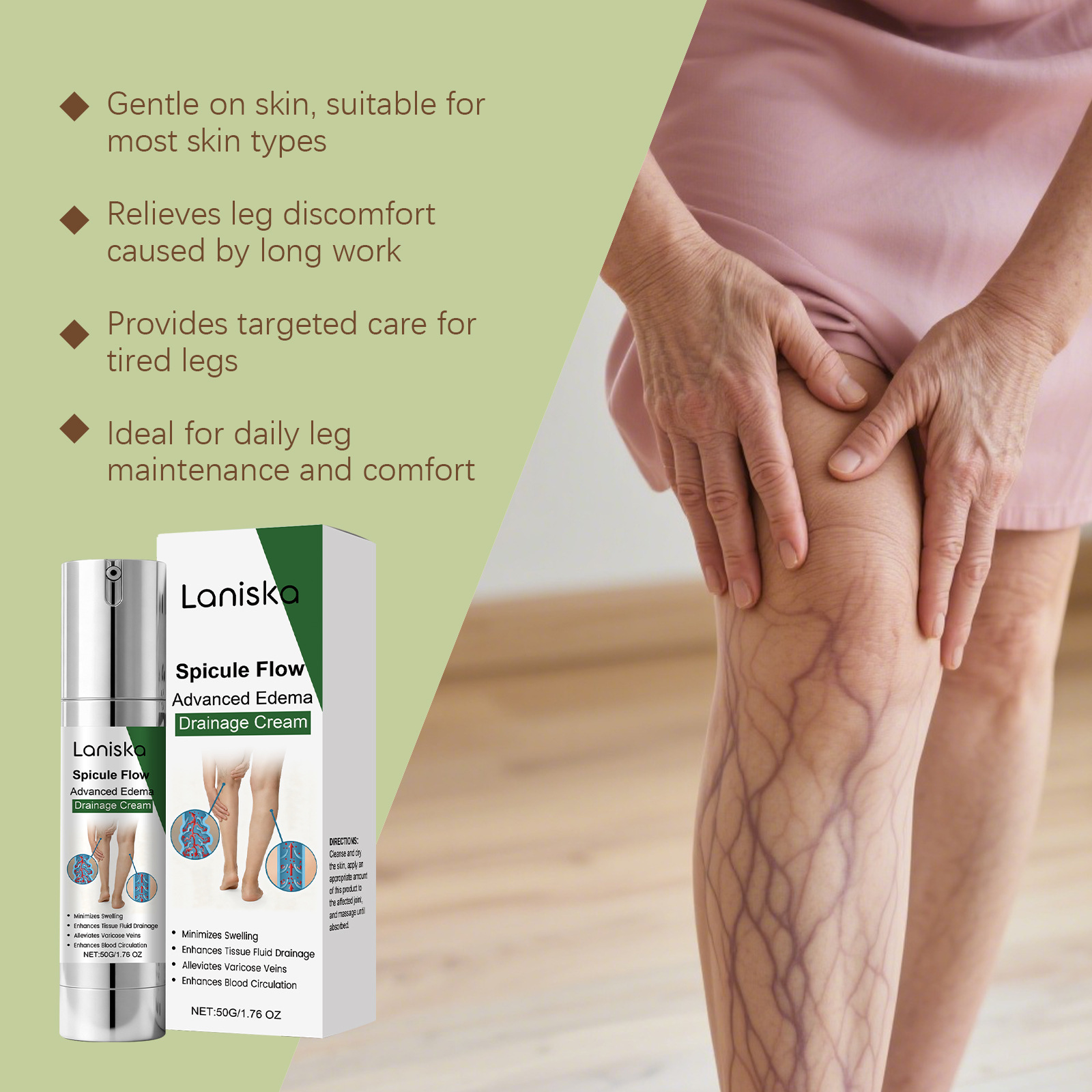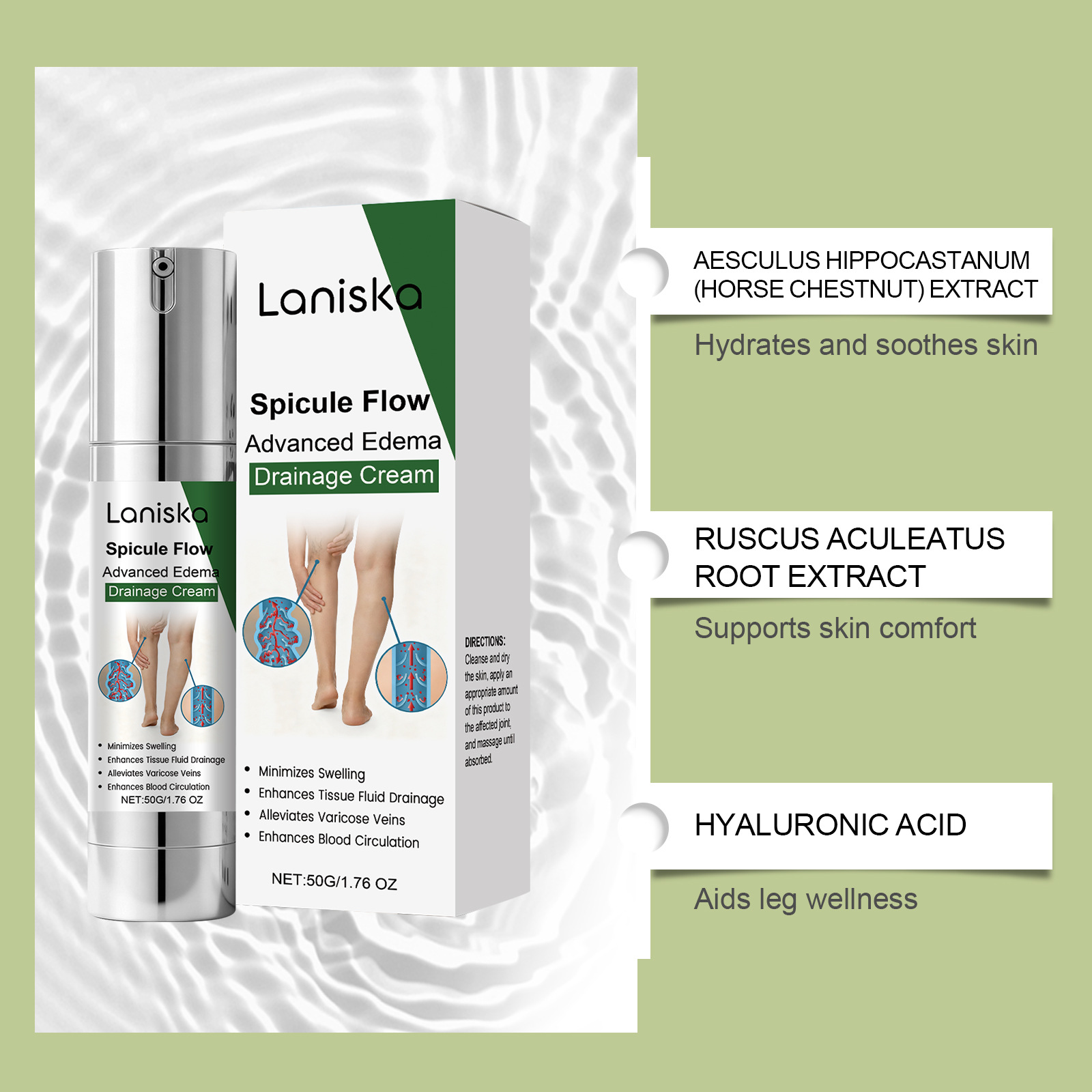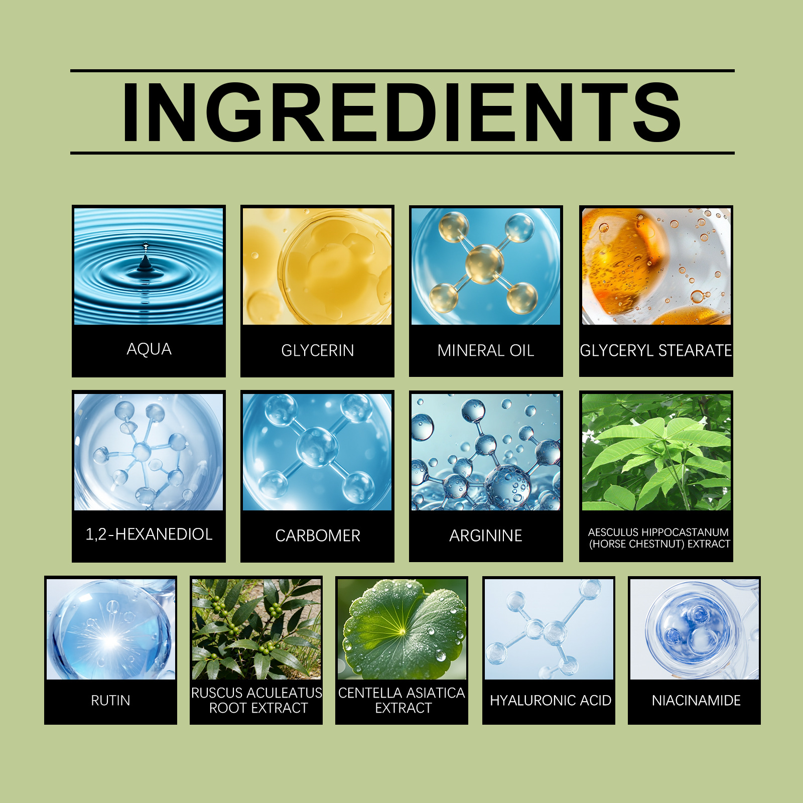 Active ingredients: Aesculus aesculus extract, rutin, Aesculus aculeatus root extract, Centella asiatica extract, hyaluronic acid, nicotinamide.