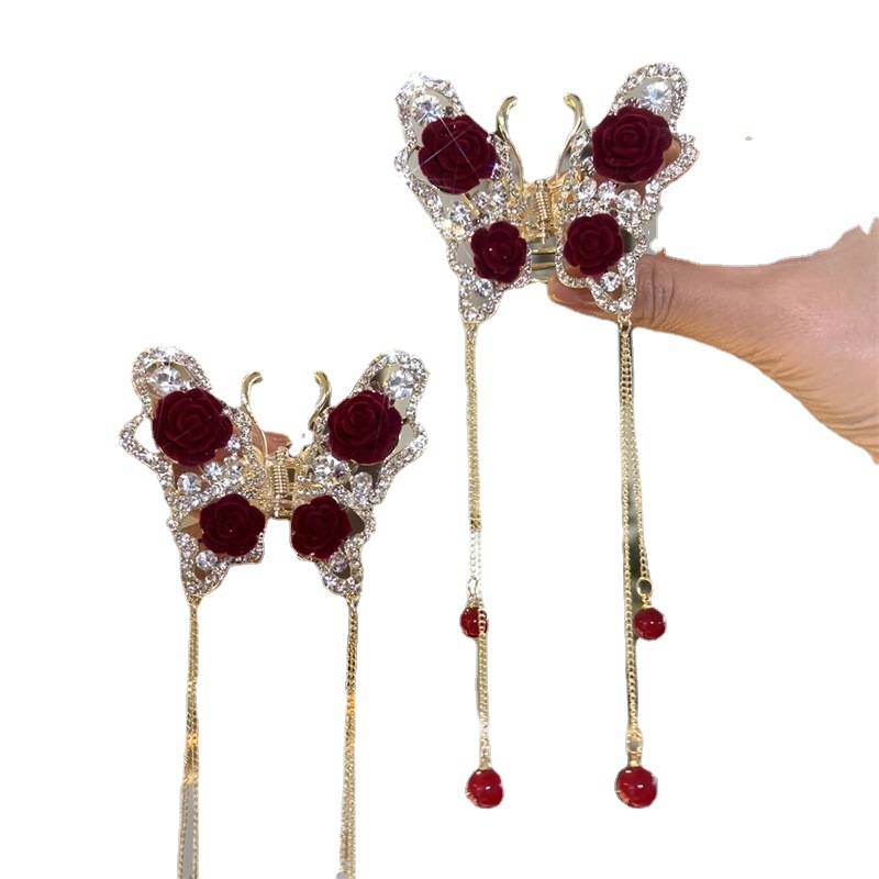 Color: butterfly rhinestone flocked flowers fringe clip, flocked flowers high ponytail fringe clip
