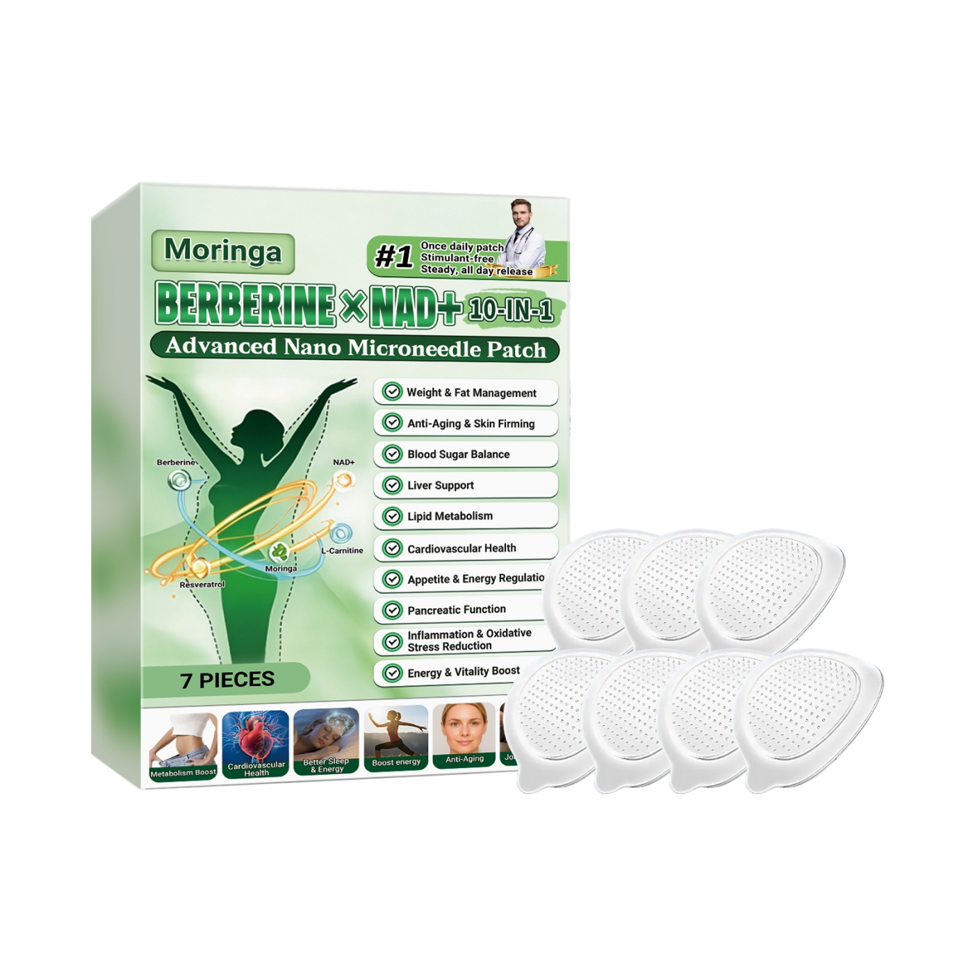 Ingredients: Active ingredients: berberine hydrochloride, nicotinamide adenine dinucleotide, resveratrol, Moringa seed extract, carnitine tartrate, curcumin, allantoin.