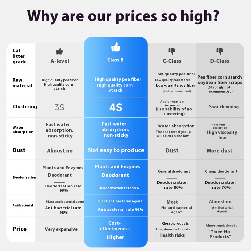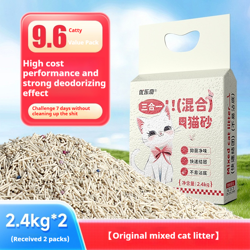 Raw material composition: pea residue, starch, corn powder, soybean curb residue, low dust bentonite, color deodorant beads