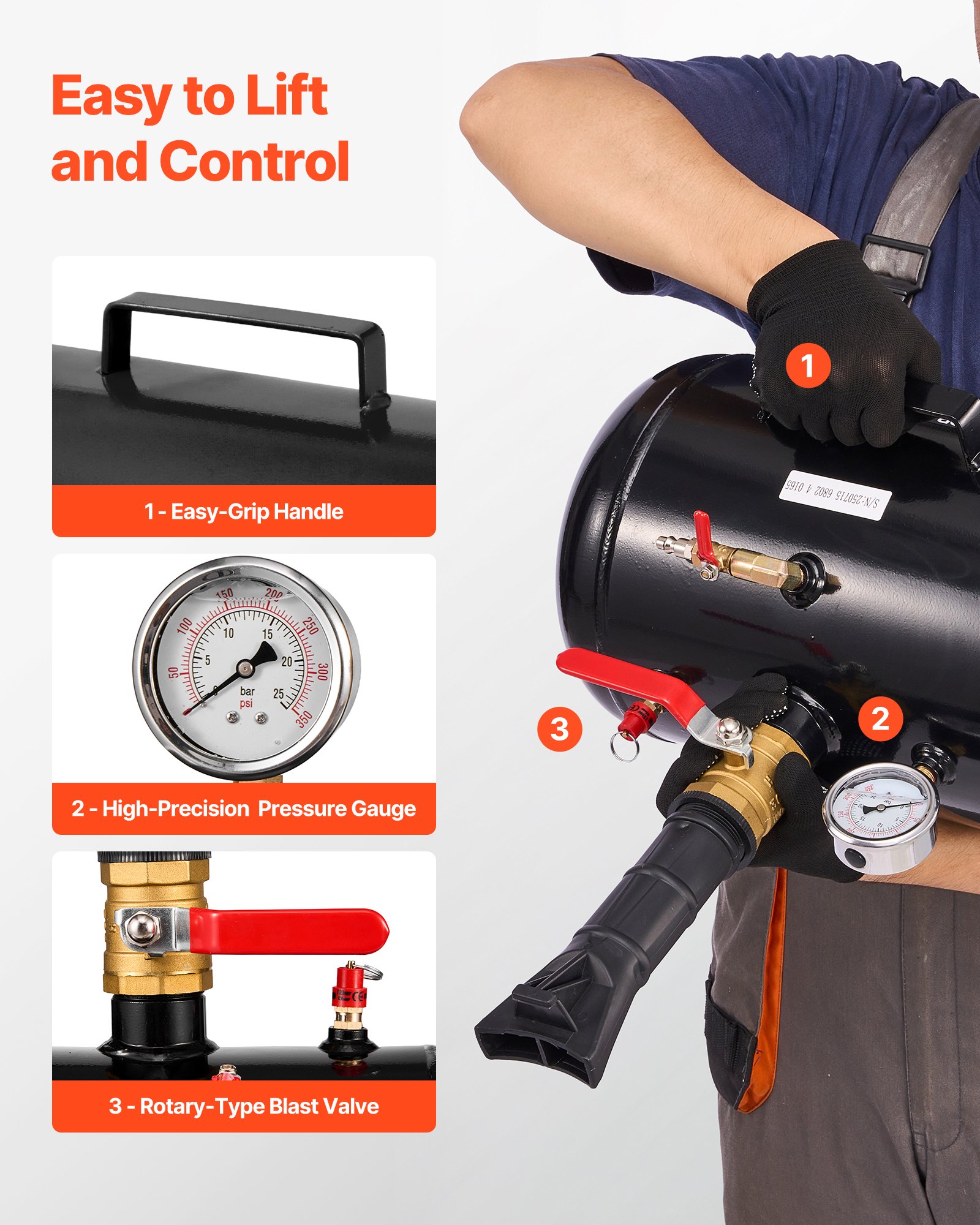 Security Features: High-pressure steel cylinder resists deformation and leakage over long-term use. The bead blaster is equipped with a safety valve that releases excess pressure beyond the max working limit. Long-neck design keeps a secure distance