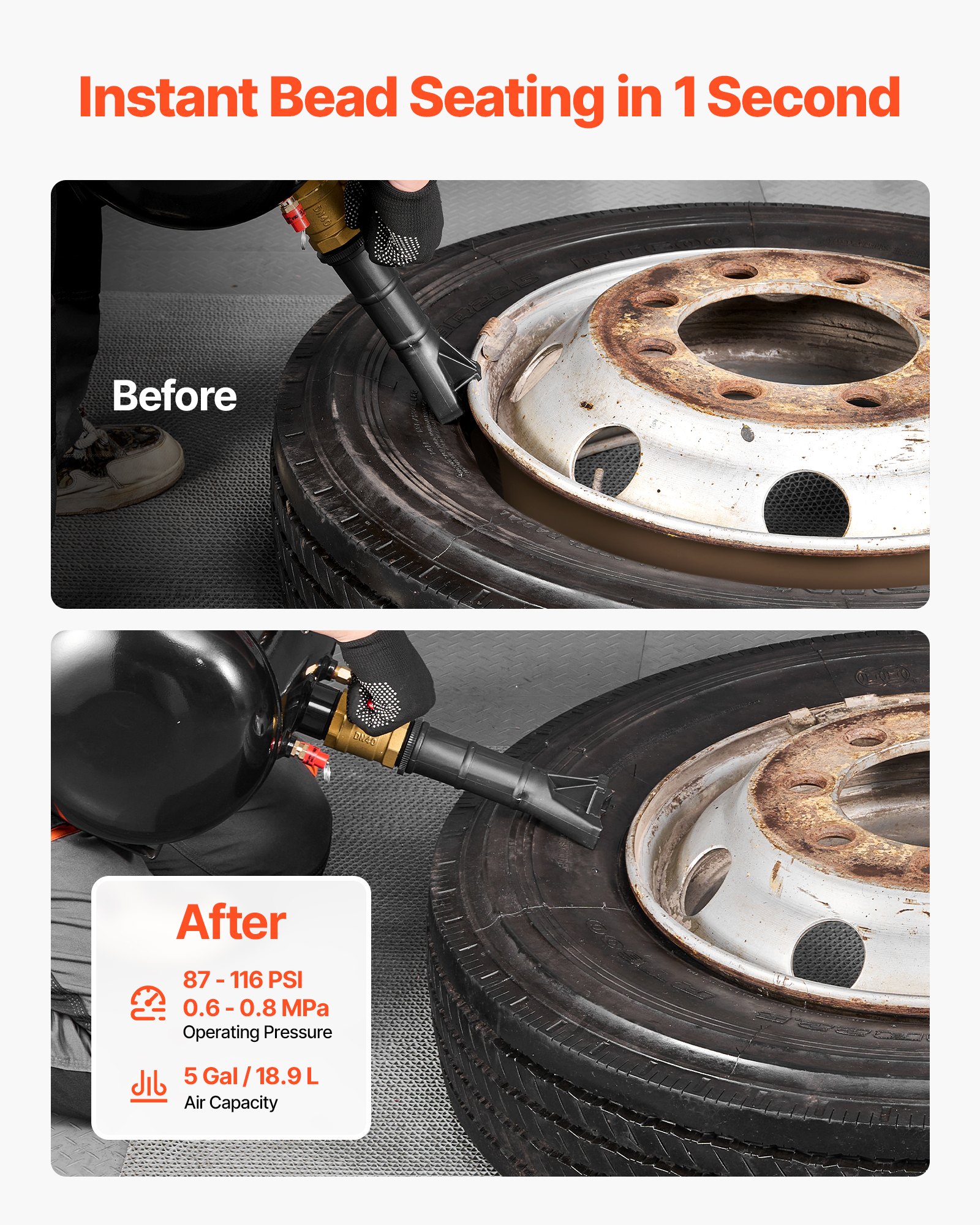 Air Tire Bead Seater, 5 Gal / 18.9 L, Heavy Duty Tire Bead Blaster Tool, 87-116 PSI Operating Pressure, Air Trigger Seating Inflator For Pickup, Truck, ATV, Jeep, Van, Lawn Tractor, RV, Black