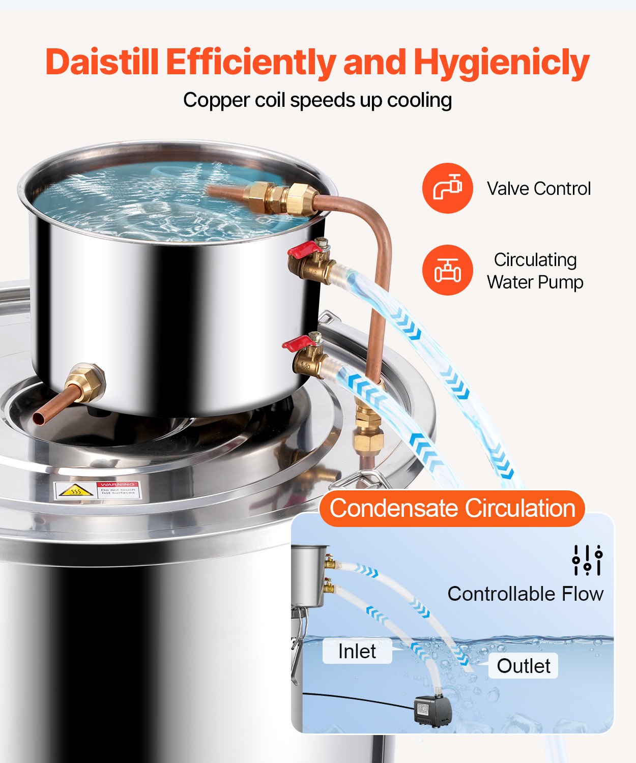 VEVOR Alkoholdestillieranlage 50 L Edelstahl Wasseralkohol Destillieranlage mit Kupferspule, Heimbrau-Raffinations-Gärungsset mit Thermometer und Pumpe, für Wein Whisky Brandy, Silber