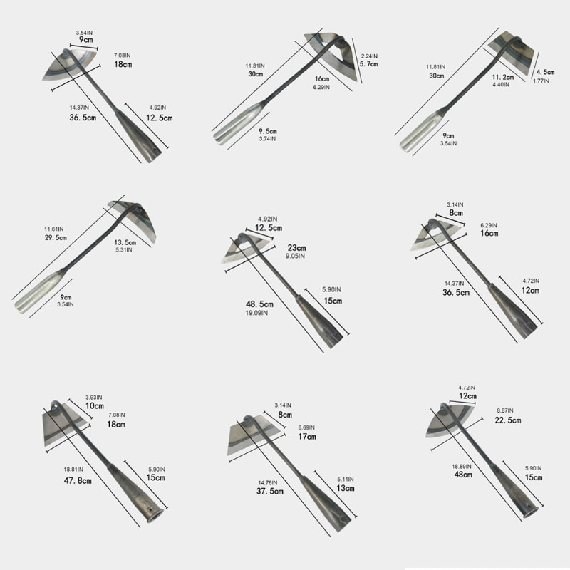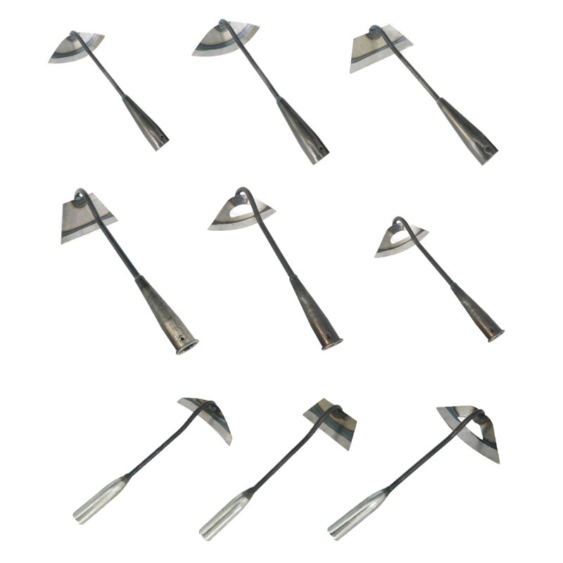 Specifications: Hand-held crescent hoe, hand-held small trapezoidal hoe, hand-held large trapezoidal hoe, hand-held hollow arc hoe