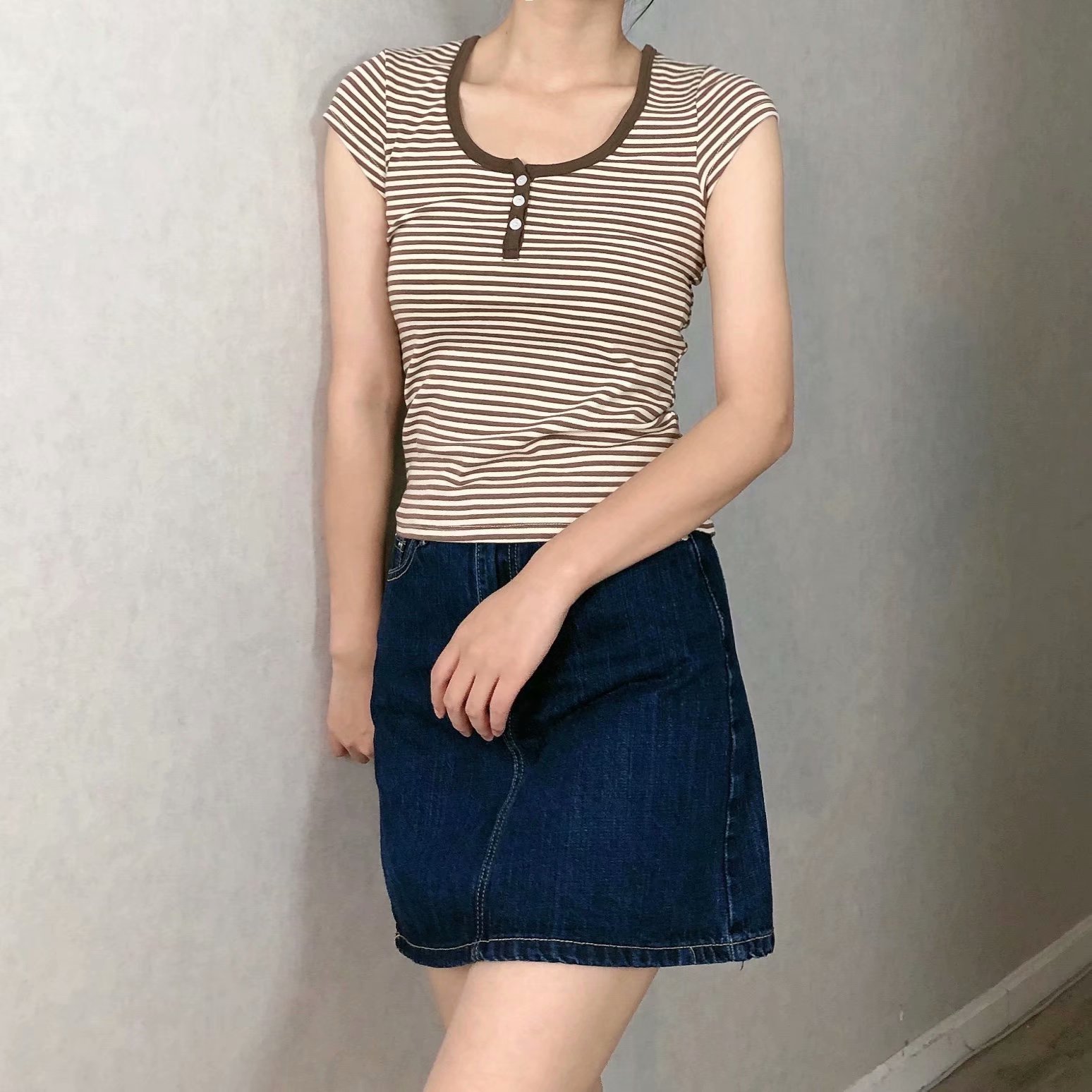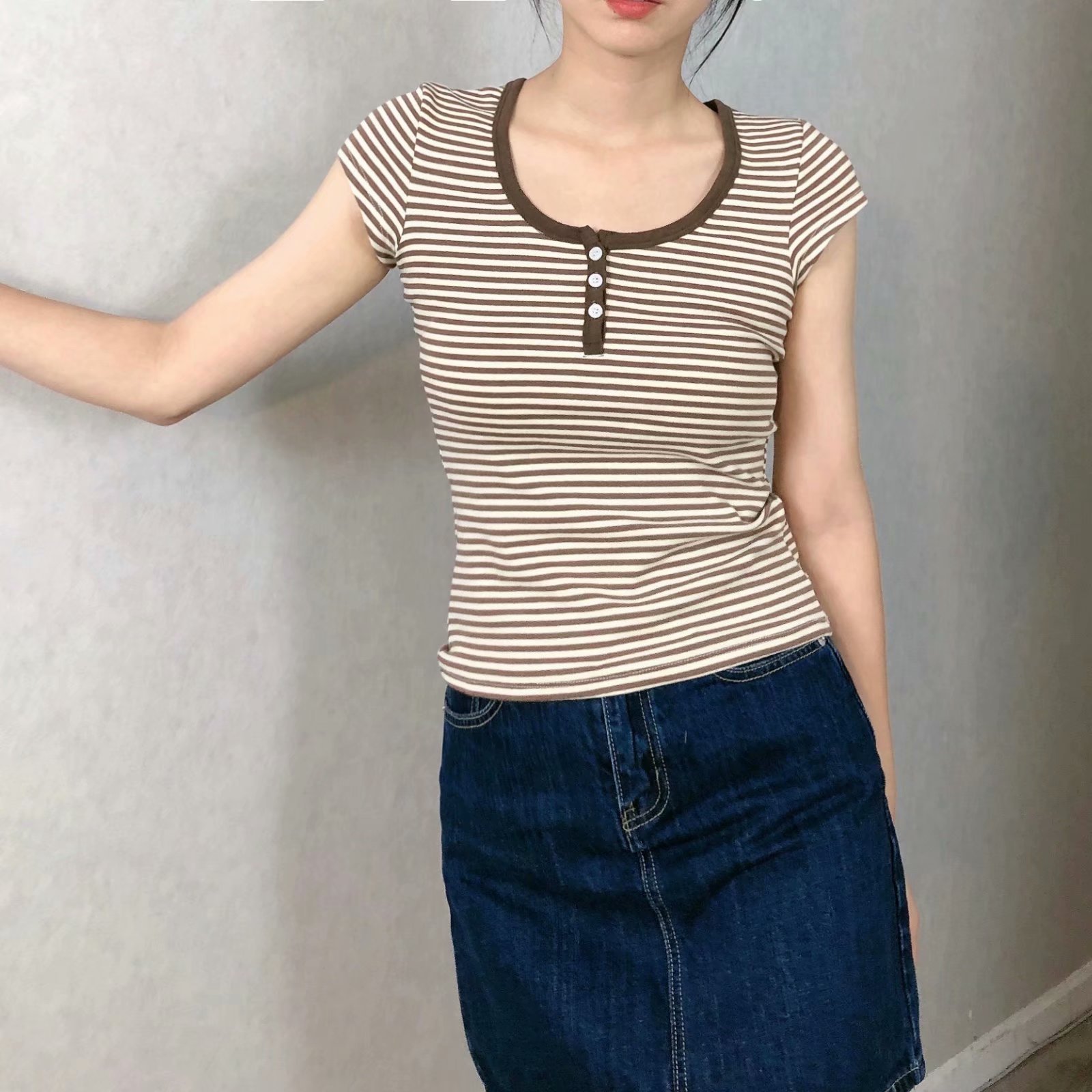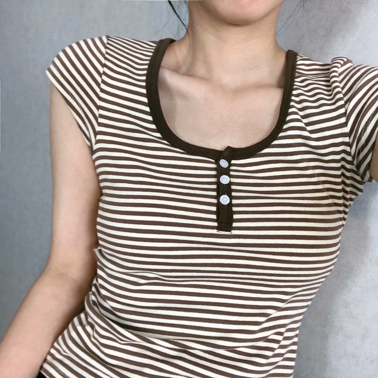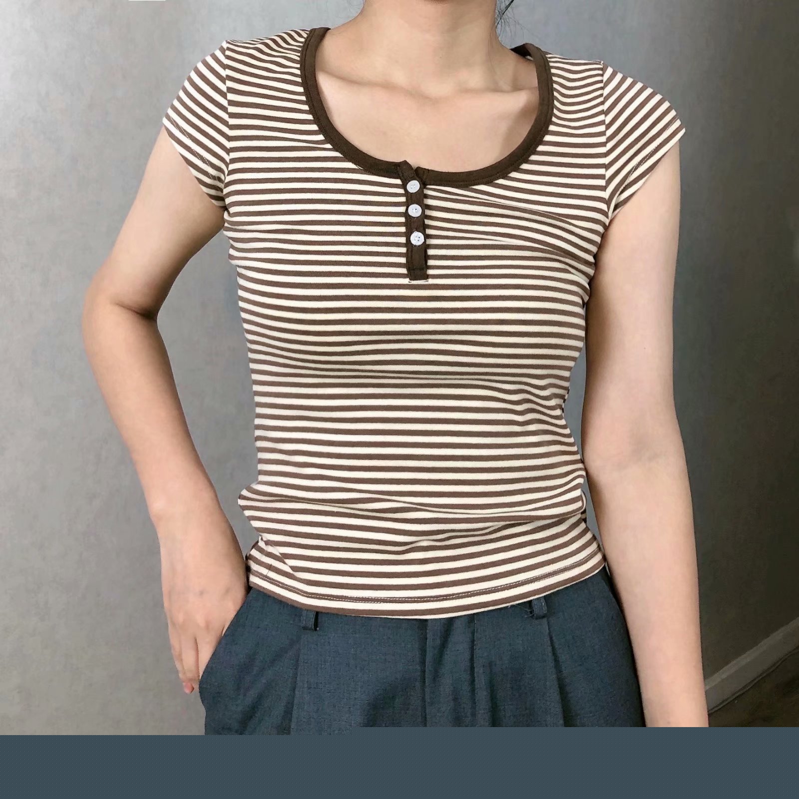 All-match Brown Striped Three-button Slim-fit Short-sleeved T-shirt