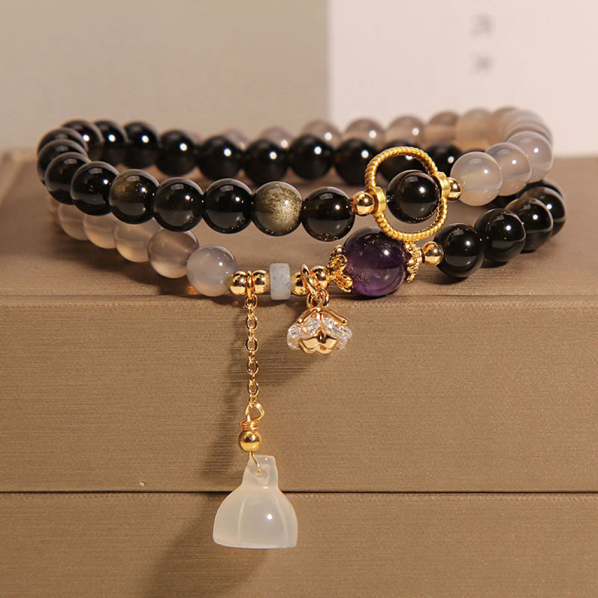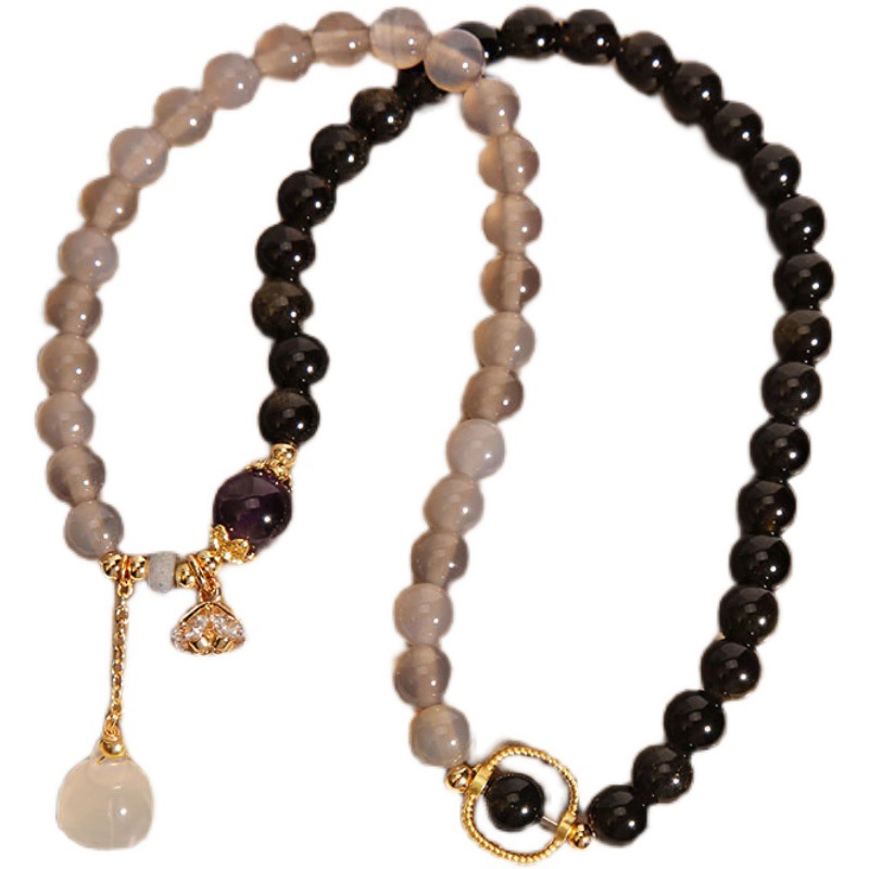 All-Match Gold Obsidian Lotus Seedpod Pendant Natural Gray Agate Double Ring Crystal Bracelet For Women