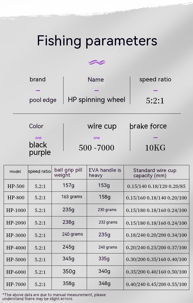 Product information:Name: HP spinning reelSpool: 500 -7000Speed ratio: 5:2:1Brake force: 10KGColor: black and purple