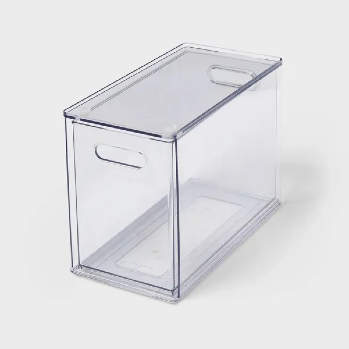 Tall all-purpose full-depth drawer Post-consumer recycled plastic material Transparent design Removable lid Side cutouts