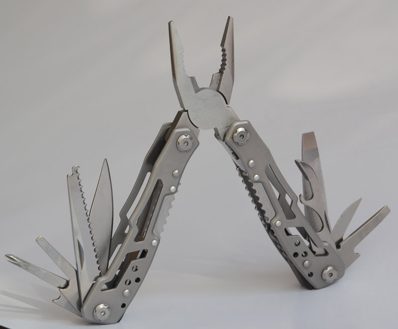 14 In one function: 1. Tong head (sharp nose pliers, round pipe pliers, scissors) 2. Small knife 3. Cross screwdriver 4. Small flat screwdriver 5. Scaly tooth cutter 6. Hook release 7. Double sided file 8. Large flat screwdriver 9. Small scraper 10. Medium flat screwdriver 11. Can opener 12. Bottle opener