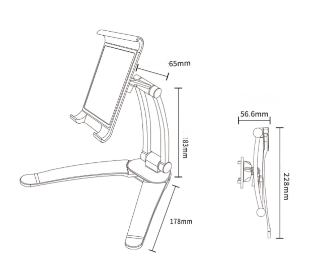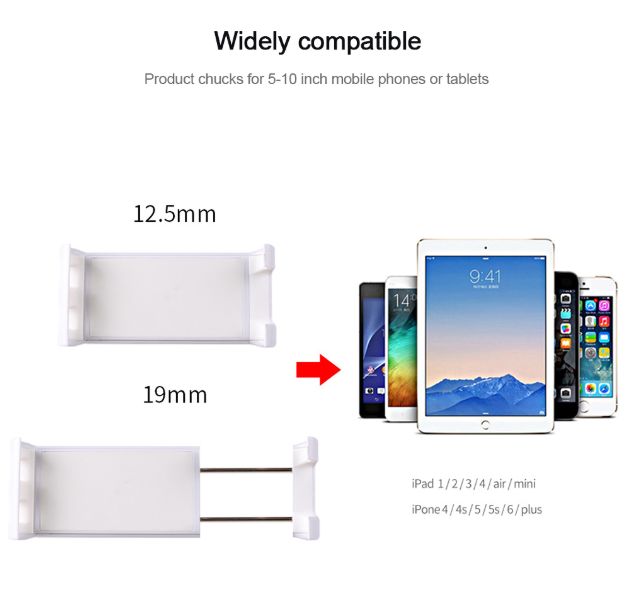 The inner side of the chuck is 12.5-19cm, suitable for 4-10.5 inch mobile phones or tablet computers