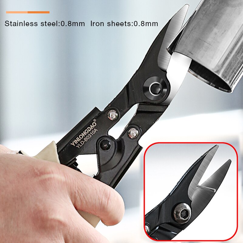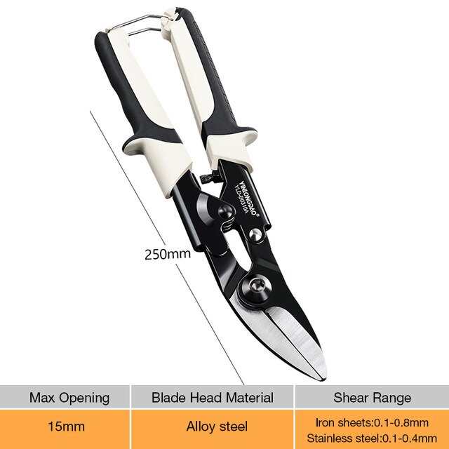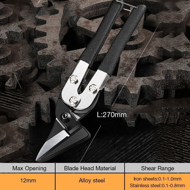 Features: high lever compound cutting shear made of chrome vanadium steel is specially designed for handle of ergonomics design, which will not cause Scratch due to repeated use. Ideal for cutting aluminum, sheet metal, leather, carpet, cardboard and plastic. The self opening action ensures that the material can be quickly fed through the jaw plate. One hand automatic lock release with dual material extrusion handle for added comfort and grip.