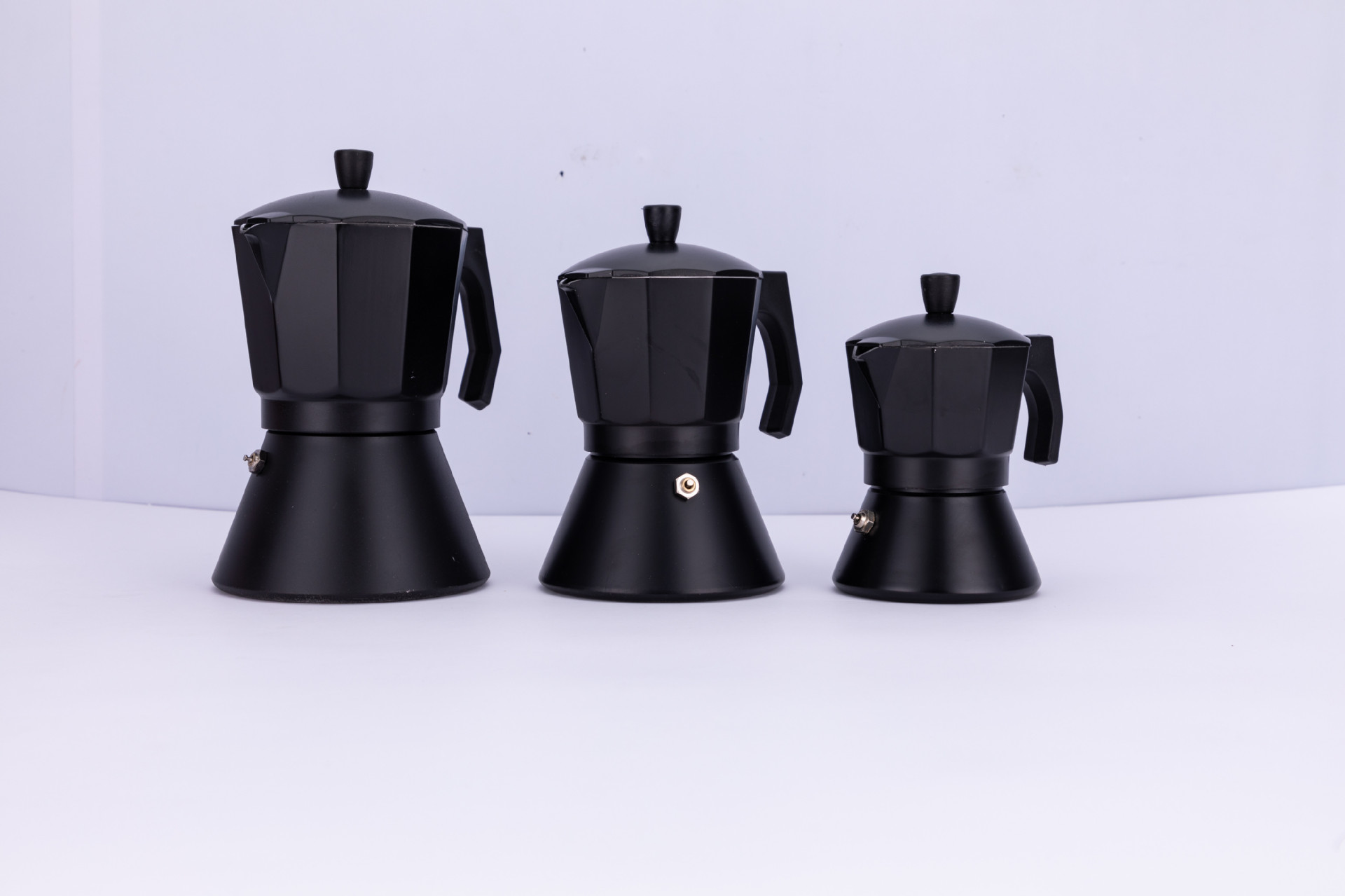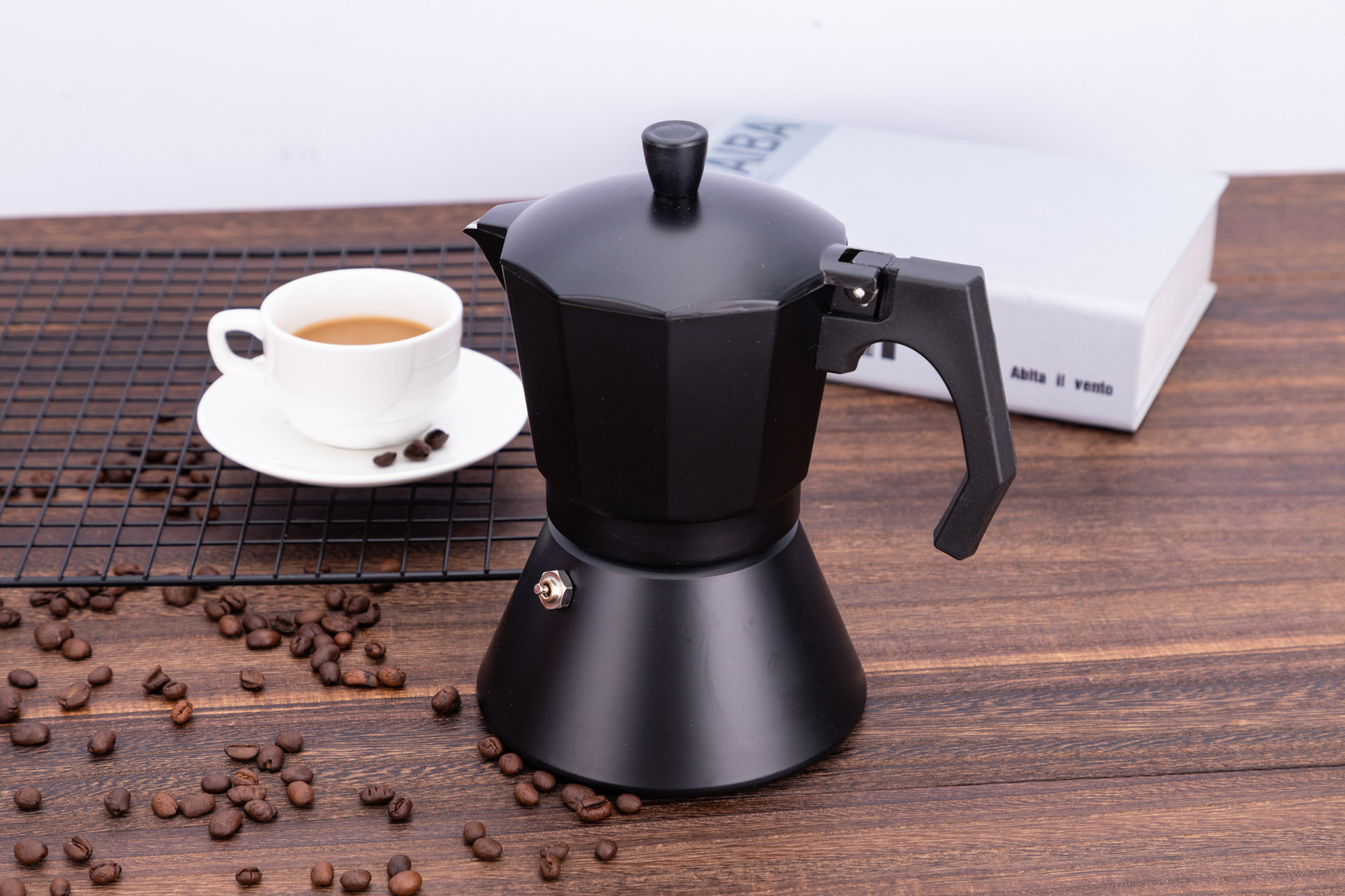 Mocha coffee pot is made of high-quality aluminum material, the color is silver, high temperature and drop resistance, easy to clean. The top of the silver coffee pot has a small black plastic round head, the body of the pot has a three-dimensional stripe design, and a black plastic hand grip is arranged on the back of the pot.
