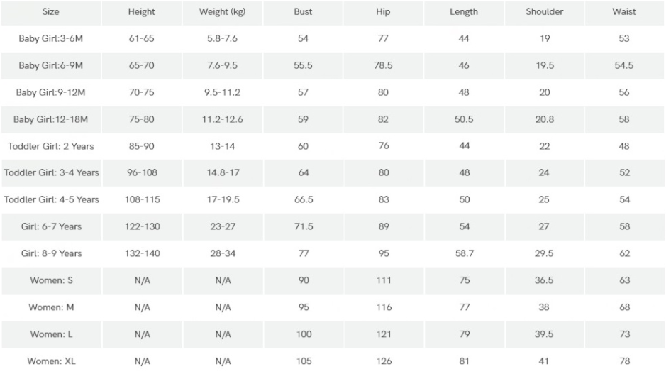Size: S, M, L, XL, girl 2Y, girl 3-4Y, girl 4-5Y, girl 6-7Y, girl 8-9Y, baby 3-6M, baby 6-9M, baby 9-12M, baby 12 -18M, baby 18-24M