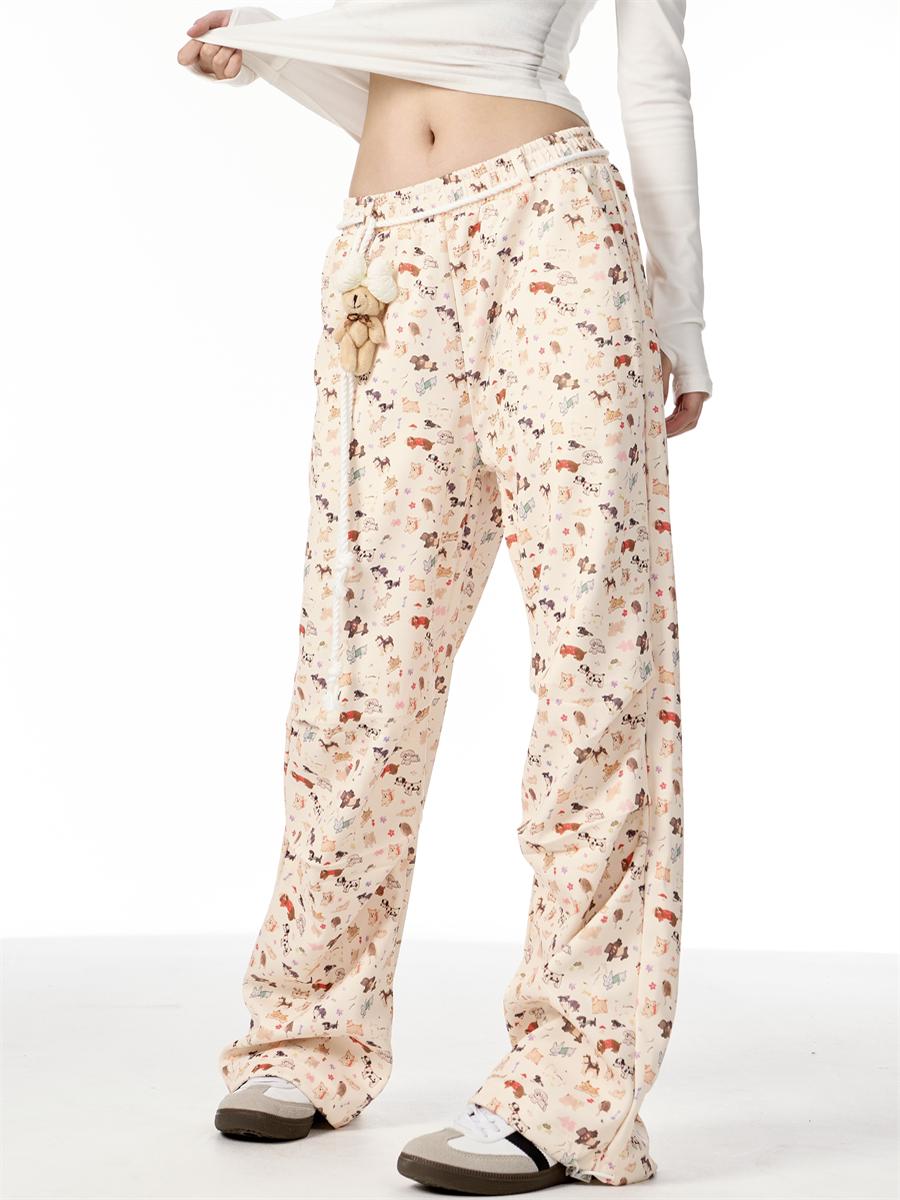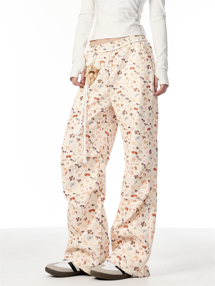 American Hand Drawn Puppy Full Printed Casual Pants Cute Doll Drooping Wide-leg Pants Female